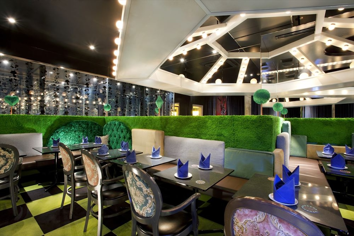 「絵本の国のアリス」の店内にはアリスが迷い込んだ不思議の国のような空間が広がっています。席数は92席。メインフロアはハートの女王の城の庭をモチーフにした緑の彫刻やガゼボがたたずむ「永遠のチェスゲーム」などで彩られています。また、メインテーブルは「終わらないお茶会」をイメージしているんです。