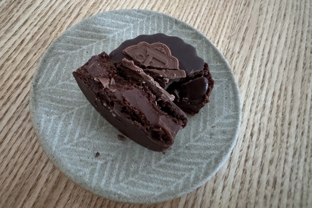 外側のパリッとしたコーティングと、サクッとしたクッキー、とろ~りなめらかなガナッシュ、チェンマイ産カカオのフルーティな味わい、自家製ラムレーズンの自然な甘ずっぱさ…と、いろいろな食感、味わいが楽しめる満足度の高いスイーツです。