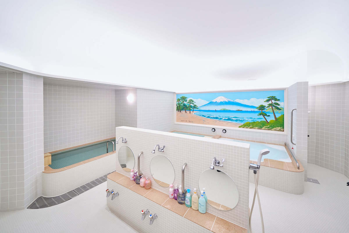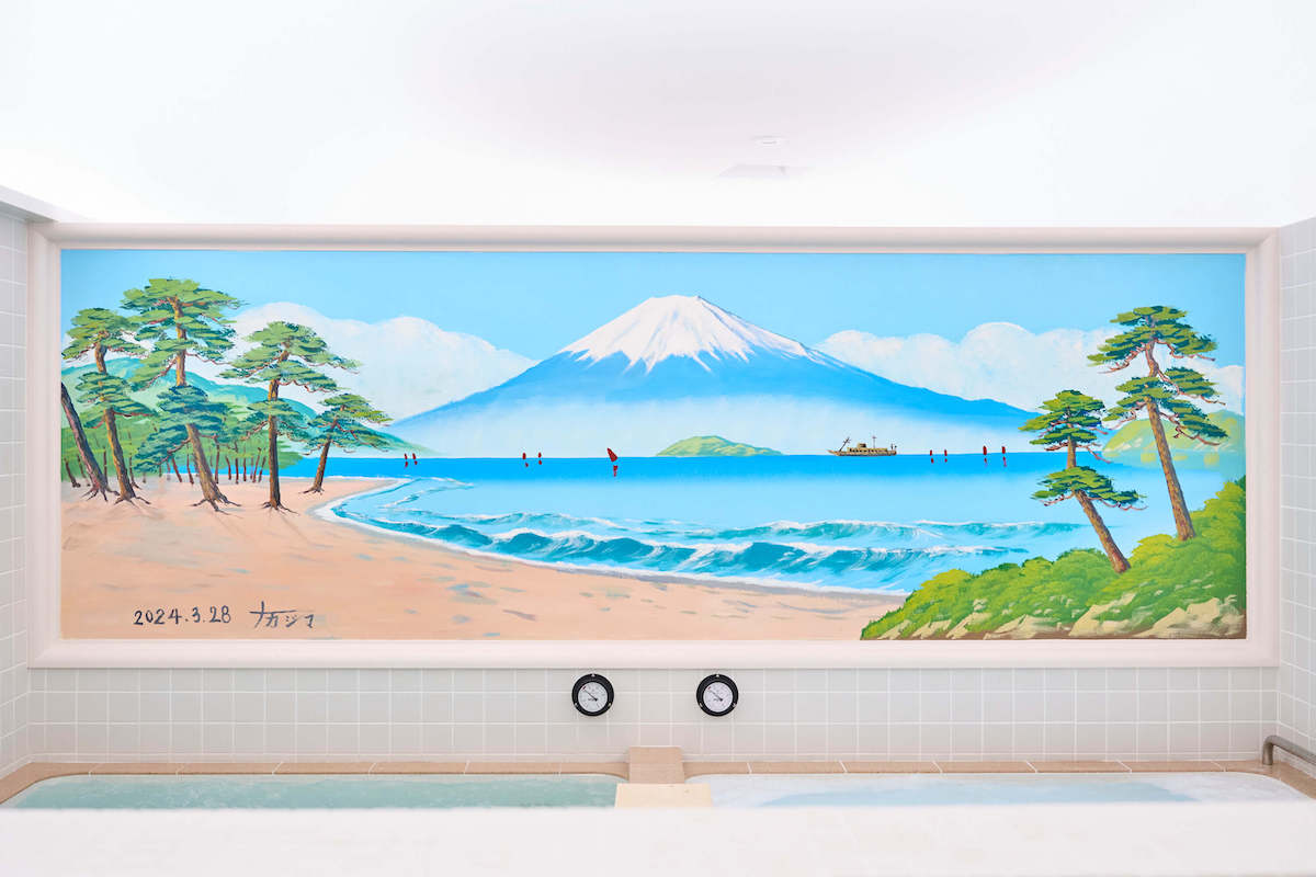 壁一面に描かれた富士山のペンキ絵は、今では日本に2人しかいないという銭湯絵師の一人・中島盛夫氏によるもの。8mほどの高い位置に描かれることが多い銭湯絵ですが、こちらは3.2mとすぐ近くで見られるのが特徴です。