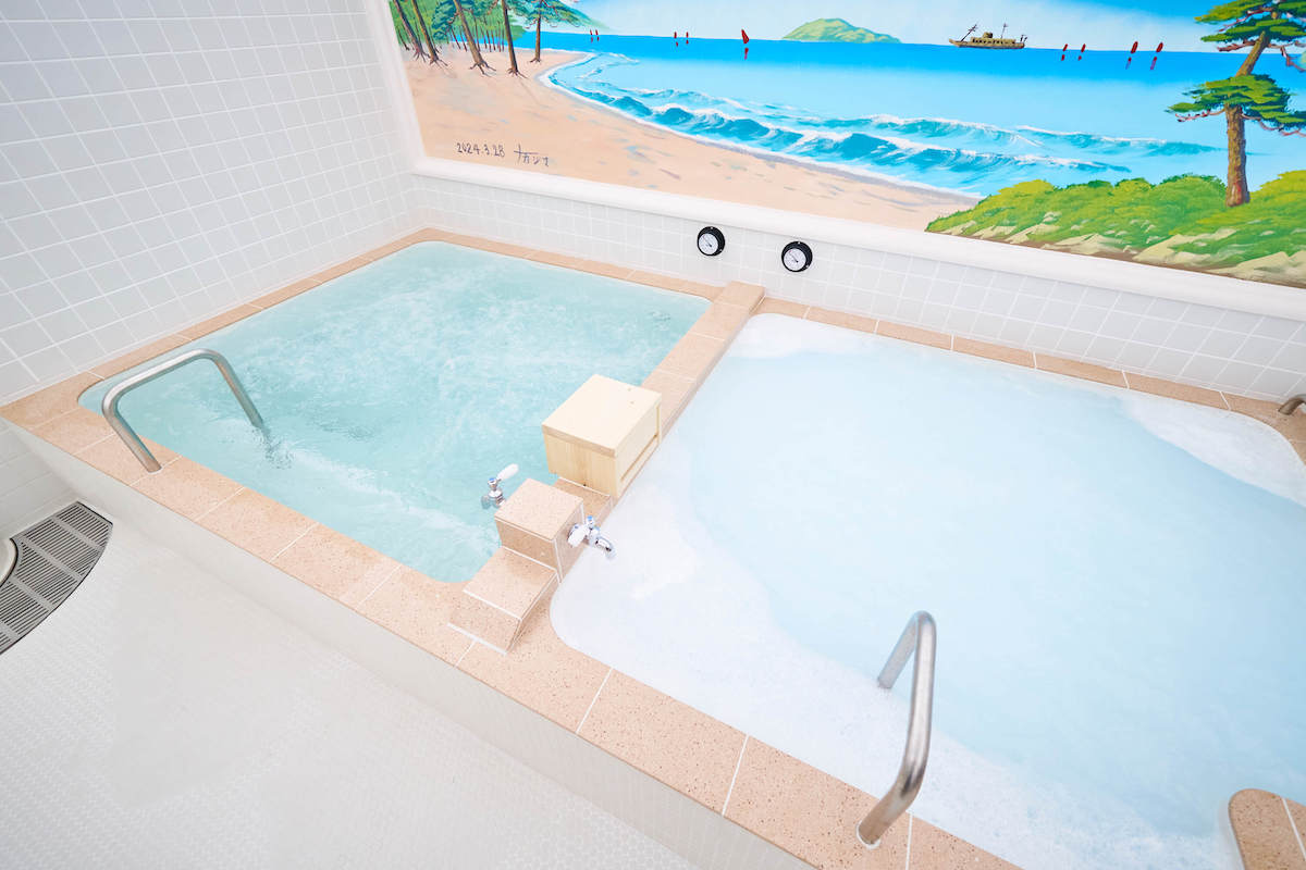 男湯と女湯はほぼ同じ大きさと形です。浴槽は3つ、初代から受け継がれてきた「小杉湯」の名物・ミルク風呂のほか、熱湯と水風呂があり、熱湯と水風呂に交互に入る温冷交互浴は原宿でも楽しむことができます。洗い場は9つで、2・3人座れる内気浴スペースもあります。