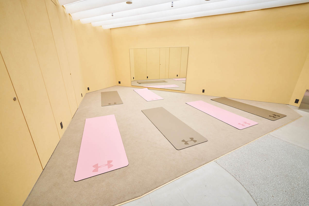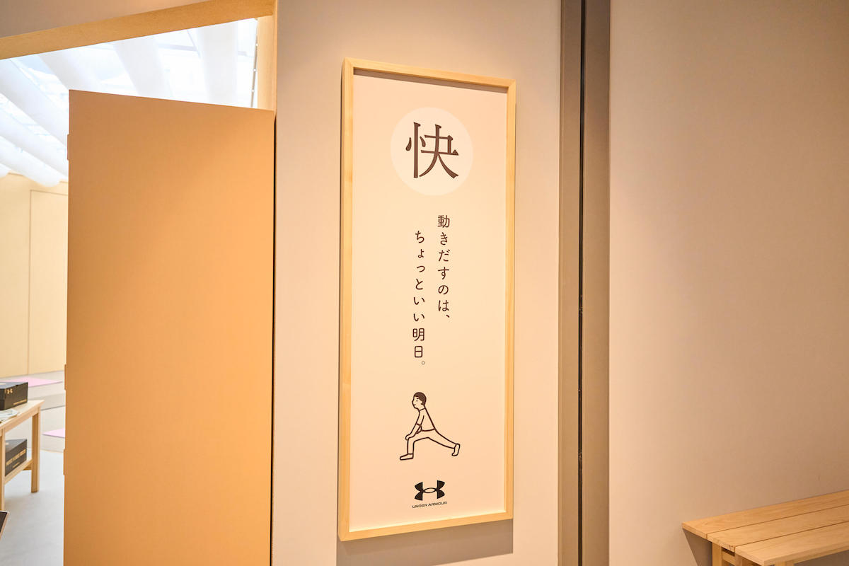 「アンダーアーマー」は「快」。誰でも利用できるランステーションとストレッチスペースを用意し、スポーツのある日常を提案。支払いは番台で行い、脱衣所で着替えて荷物をロッカーに預けたらランニングへ、原宿周辺を走った後は大きな浴槽に使ってリフレッシュ。