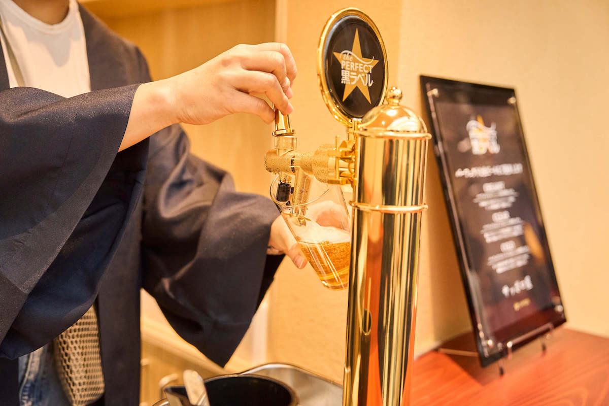 「星」を掲げる「サッポロビール」は、ピールスタンドで「黒ラベル」の生ビール体験を提供。本来の味と香りを楽しめる最適の冷たさ、さわやかな味わいのクリアなビールが注げる清潔なグラス、そして、きめ細やかで口当たりのよいクリーミーな泡になる7:3の黄金比で「黒ラベル」を飲めるのは生ビールならではです。