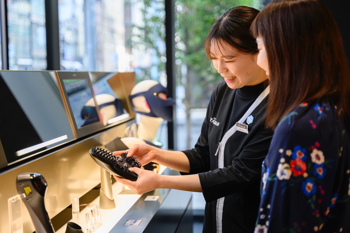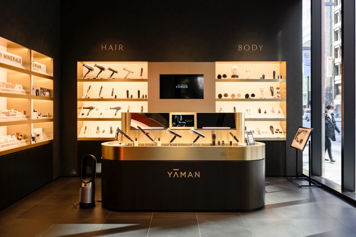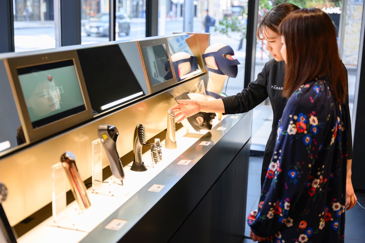 高級デパートやブランドショップが立ち並ぶ銀座中央通り。花椿通りとの交差点角に、黒を基調としたクールなデザインの「YA-MAN the store GINZA」があります。ここはRF(ラジオ波)美顔器の「フォトプラス」シリーズや、ウェアラブル型美顔器「メディリフト」シリーズなどで知られる美容機器メーカー「YA-MAN」の商品をすべて揃えたグローバル フラッグシップストア。