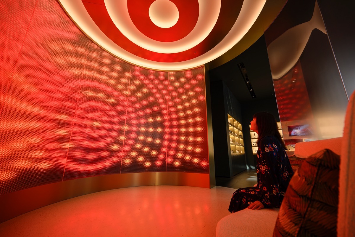 たくさんの商品に搭載されているLED光美容テクノロジーの「美肌光」。お店の中央にある光るブースは、この「美肌光」を疑似的に体験することができる「美肌光ステーション」なのです。5148個のLEDから発せられる赤、緑、黄色の光は美顔器に使用しているものと同じ光源を採用しているそう。できることなら、ずっと浴びていたいくらいです。