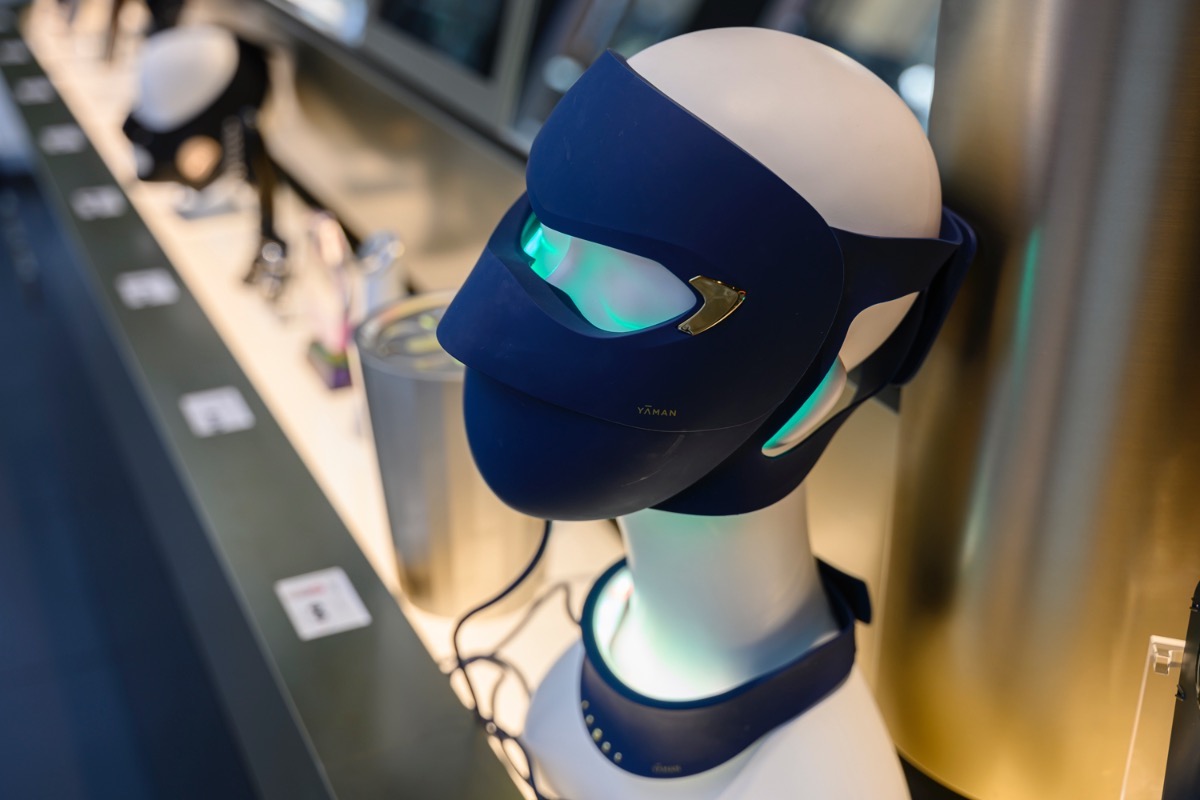 好きな時に「美肌光」が浴びられる商品もあります。このウェアラブルLEDマスク「ブルーグリーンマスク」11万円は、密着3D構造のシリコンマスクに346個の高輝度LEDライトを搭載。赤、黄色に加え、肌の明るさ、透明感と関係性が深いヤーマン独自のブルーグリーンの「美肌光」が受けられるんです。