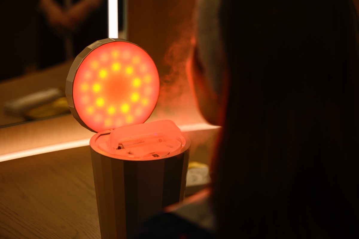 まずはフォトケアのスチーマーを使ったクレンジングから。3分間スチームをあてて肌を40℃まで温めることで毛穴が開き、すみずみまでスムースなクレンジングが行えます。一緒に「美肌光」の赤と橙色のLEDを浴びて肌ケアも。