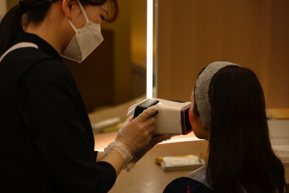 次に専用の機械を使って3D肌測定。毛穴やシワなどお肌の気になる部分を立体的に測定してくれます。なかなか人には見せられないリアルな状態にどきり。でも、こうして現状を知ることで、どうケアすればよいのかがわかるから、しっかり確認しておきましょう。