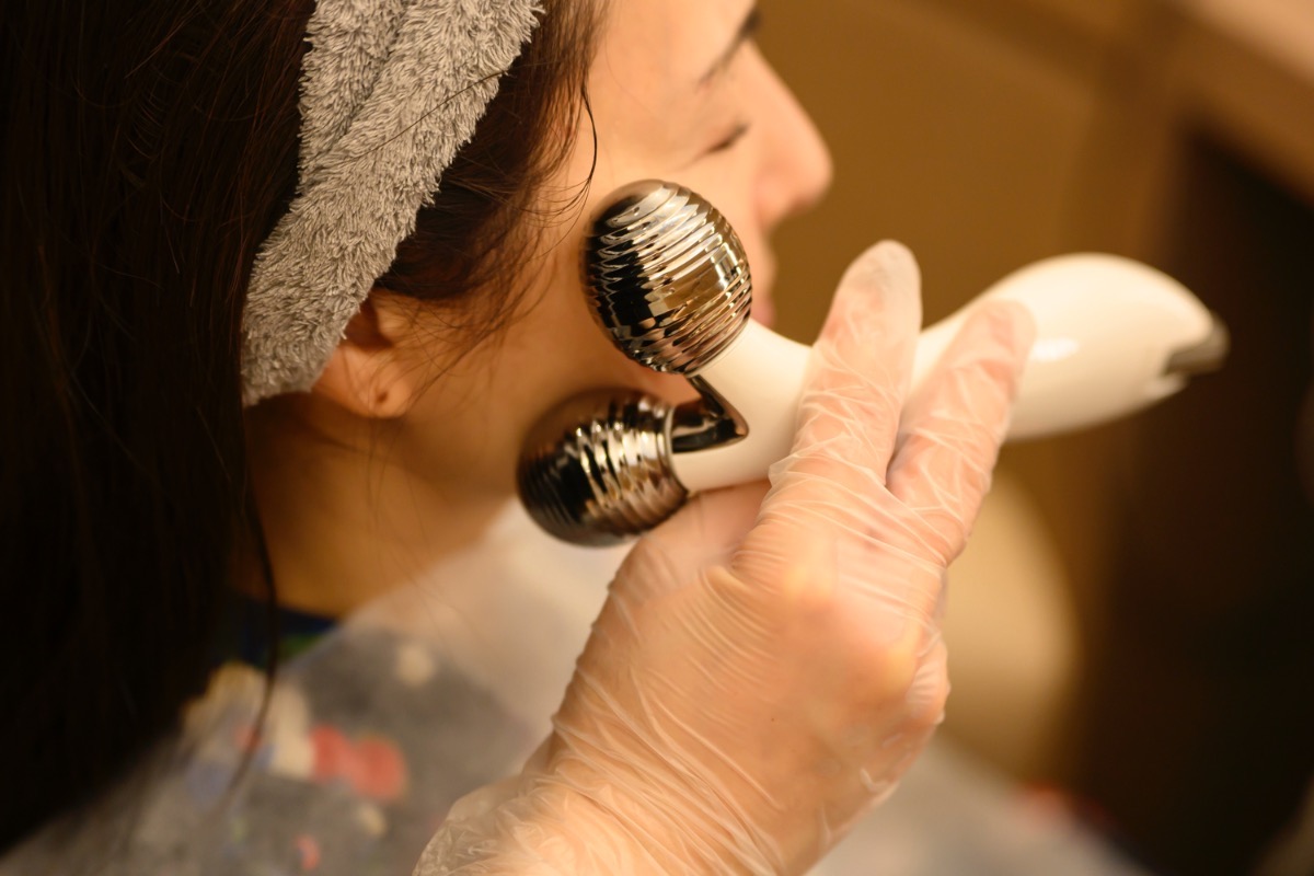 トレーニングの最後は、筋肉の大きさによって「WAVY」「WAVY mini for Salon」を使い分けて、中周波・高周波の刺激でより深部の筋肉の層にまで丁寧に刺激を与えます。独自開発のトルネードローラーが、お肌を軽くつまむような感じで密着性があります。