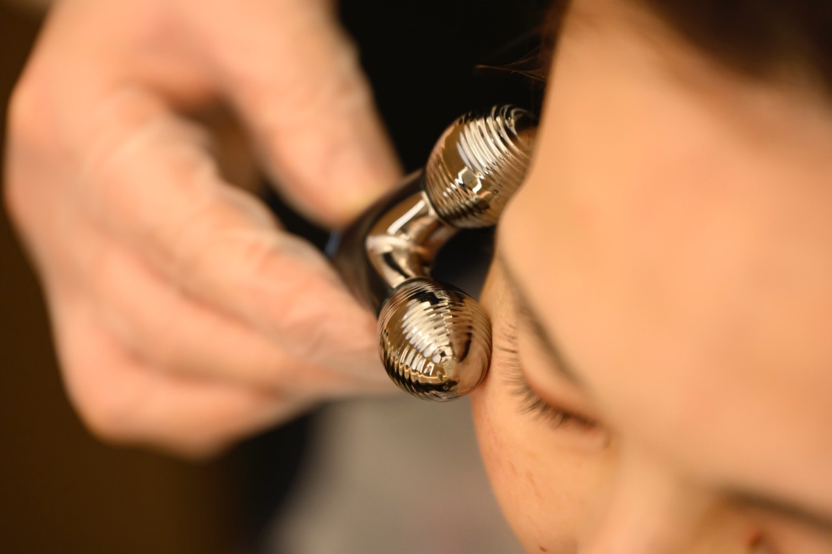 いよいよトレーニングの開始です。6本の硬めのニードルが回転し、まるで指で摘まれているような感覚で揉みほぐしてくれる「ヴェーダニードルスパ BS for Salon」で5〜8分デコルテや頭皮をほぐします。