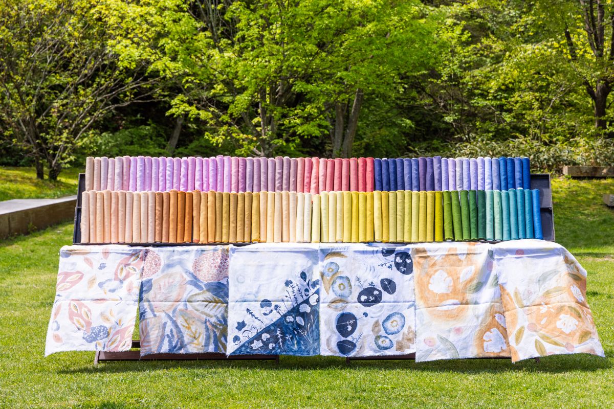 2025年4月28日(月)~6月10日(火)の期間に開催するイベント「Organic Wind」で会場を彩る色とりどりの布は、長野県内で収穫されたコブナグサ、クルミ、アカネ、ヤマモモなどの自然の素材で染色。1枚1枚異なる色合いが特長です。
