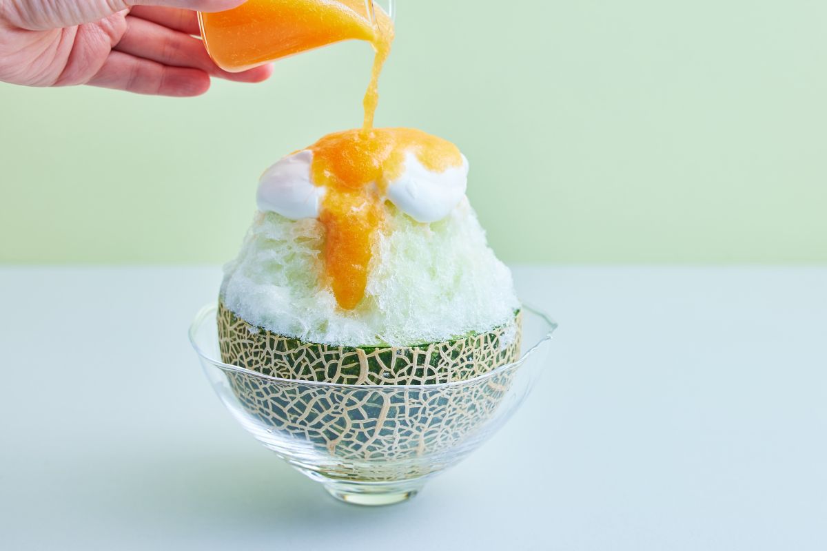 かき氷には、メロンシロップをかけ、ホイップクリームと⾚⾁メロンソースをたっぷりトッピング。⾚⾁メロンソースは⾷べる直前に自分でかけることができるので、その様⼦をぜひ動画におさめてみて。映え必至な動画が撮れますよ!