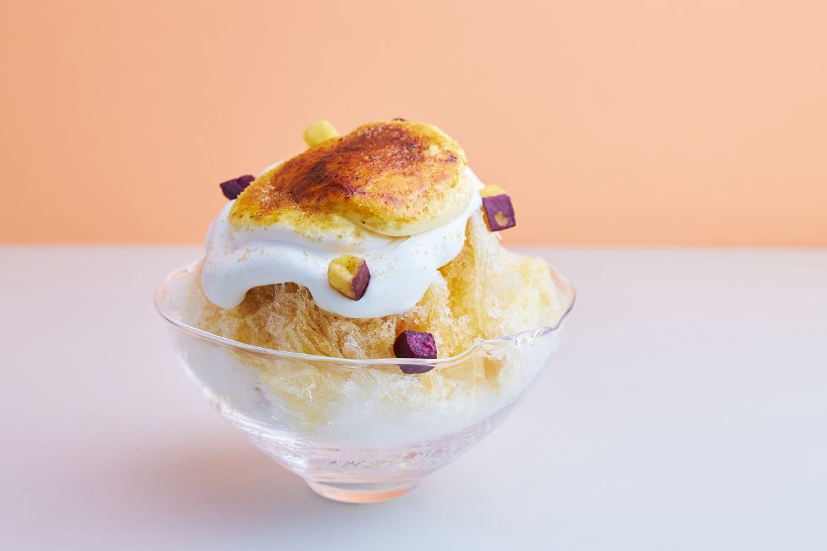 そんなサツマイモを使った「冷やし焼き芋かき氷」1500円は、かき氷に芋蜜シロップをかけ、焼き芋とカスタードホイップをあわせた焼き芋クリームをたっぷりとトッピング。キャラメリゼして仕上げてあるので、表⾯はパリッと、中⾝はトロッとした不思議な⾷感を楽しめます。