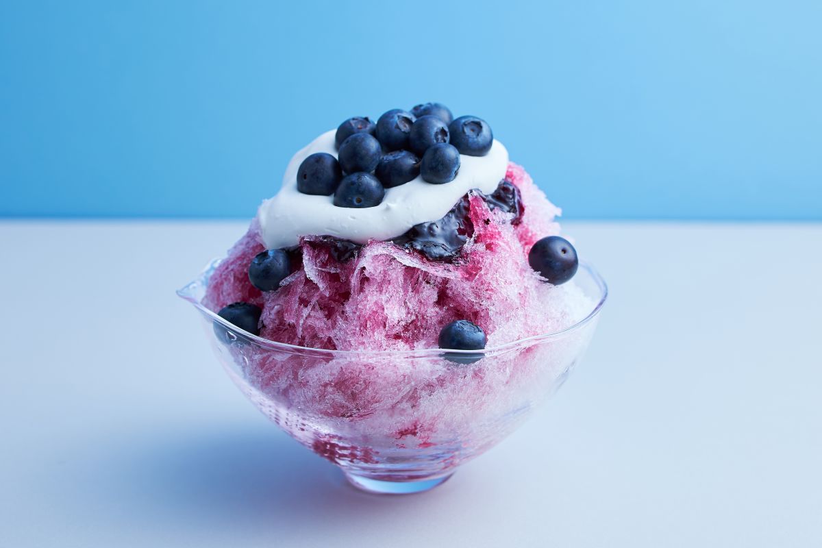 「ごろごろブルーベリーかき氷」1500円はオリジナルのブルーベリーソース、ホイップクリームがかかったかき氷に、ブルーベリーを器からこぼれ落ちるくらい盛り付けることができます。さわやかで⽢酸っぱい味わいのブルーベリーが夏にぴったり!