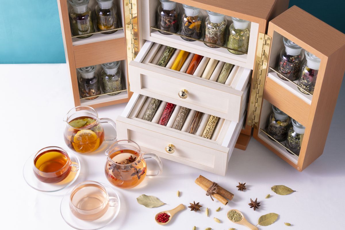 薬の歴史を振り返ると、医師が調剤⽤に使⽤していた薬箱は、多種多様な乾燥した薬⽤植物を収納、そして持ち運ぶ必要があったことから⼤型でした。そんなかつての薬箱をイメージし、オリジナルスパイスティーで使⽤するスパイスや茶葉をボックスに収納。