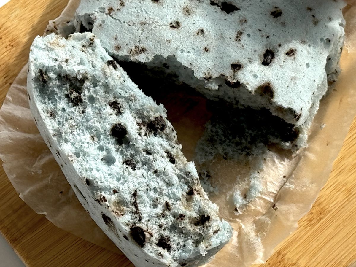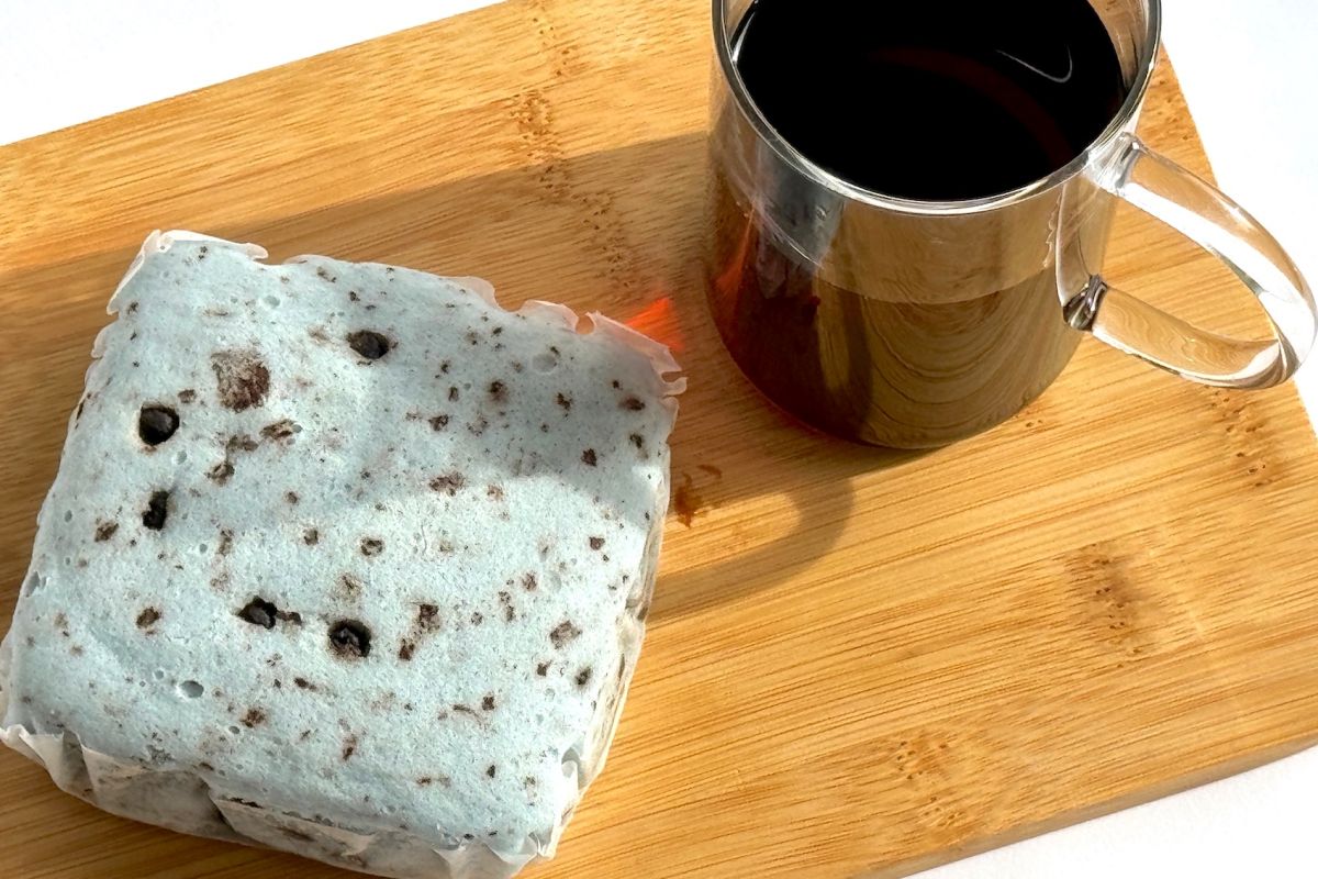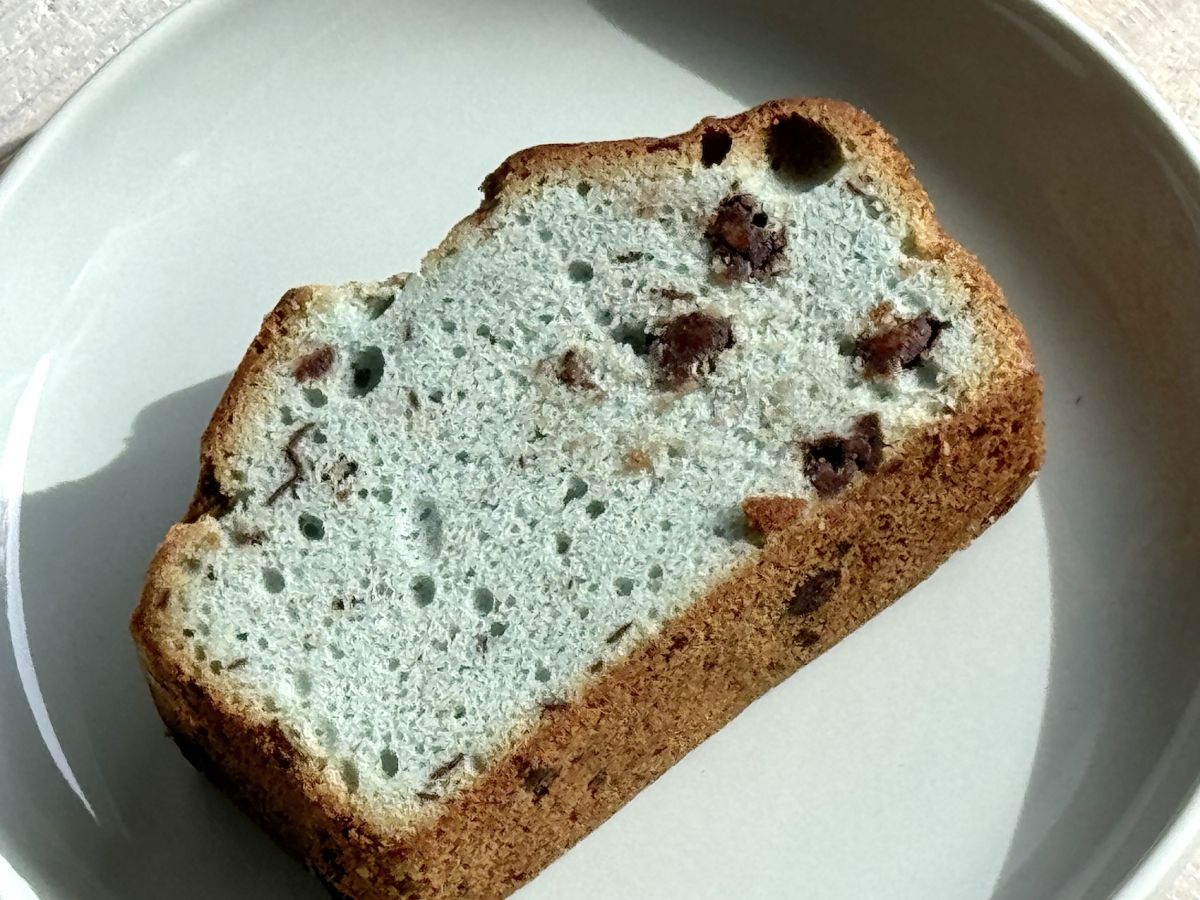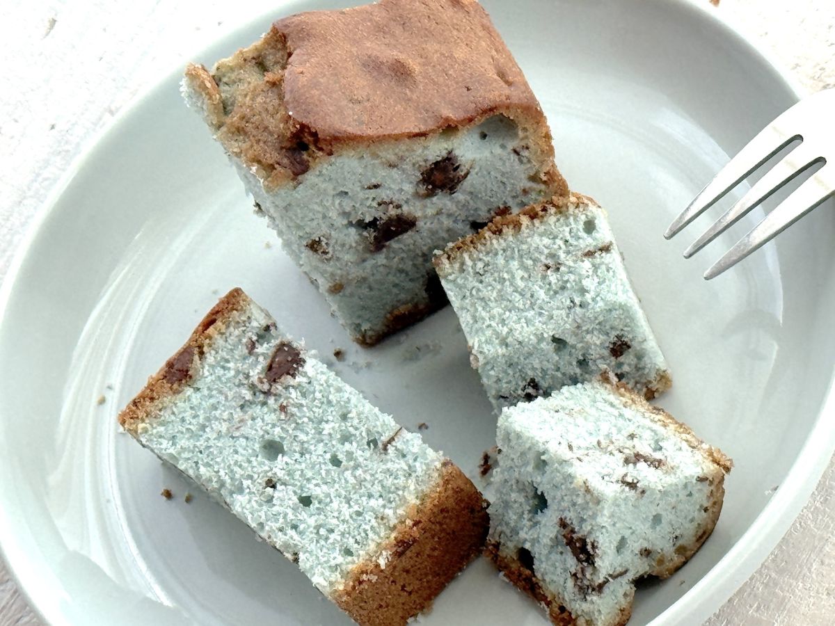 外側はこんがりとした焼き色がついていて、中の生地はきれいなミントグリーン。焼き菓子でチョコミント味、しかも青いというのは、ちょっとめずらしいような気がします。