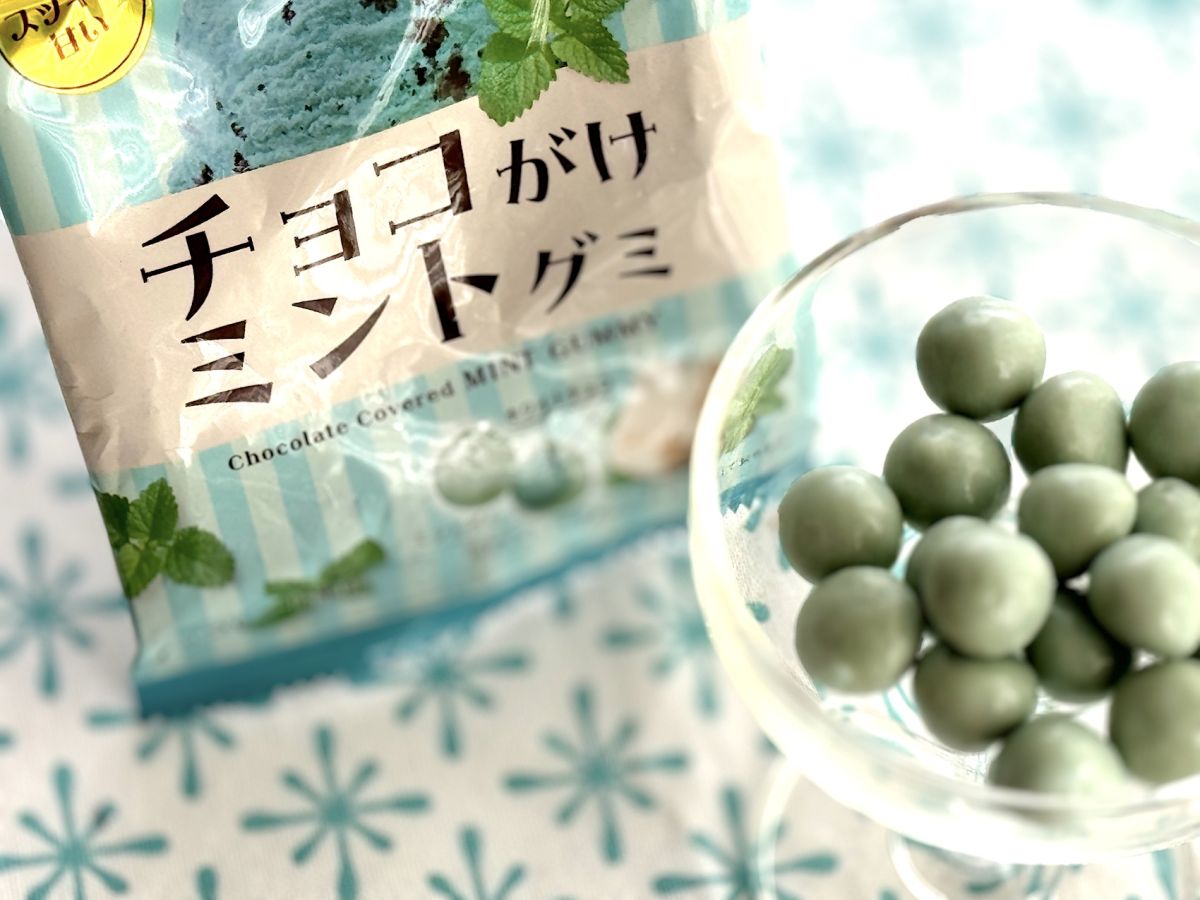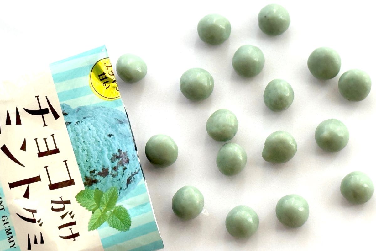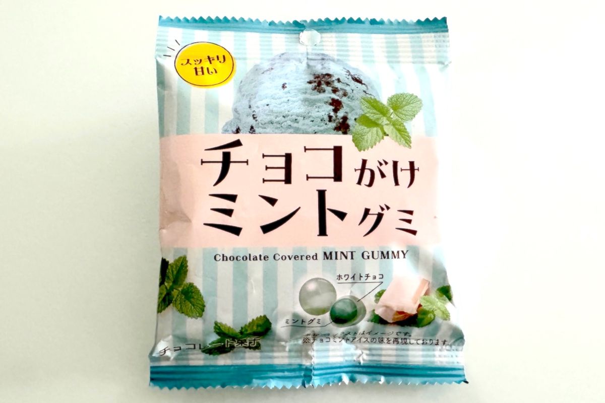 スッキリ清涼感のあるミントグミに、ホワイトチョコレートをコーティングした「チョコがけミントグミ」198円。パッケージを見た感じでは、チョコミントのアイスクリームの甘いイメージが湧いてきますが、実際はどうでしょう……。