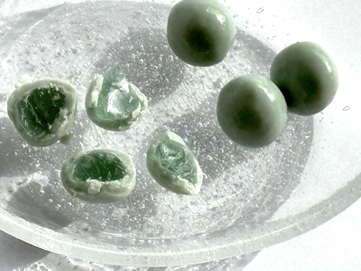 ひと粒口のなかに入れて、口の中で転がしていると、ホワイトチョコレートのやさしい甘さに満たされます。チョコレートがとけて、つるんとした食感のグミがあらわれて噛みしめると、今度は一転してほろ苦く、清涼感にあふれたミントの味が口のなかに広がります。ミントの葉を、そのまま噛んだような強い風味で、丸くてかわいらしい見た目とは裏腹に、刺激的な大人味です。