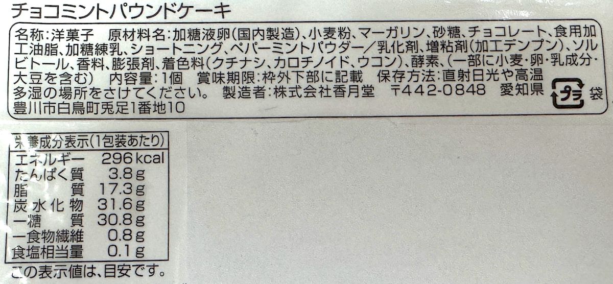 パッケージを開けたとたん、さわやかなミントの香りが漂う「チョコミントパウンドケーキ」180円。