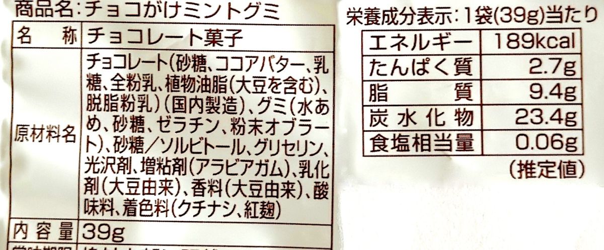 グミはかみごたえたっぷりのハード系。チョコが口の中でとけてしまう前に噛むと、チョコの甘さとミントのほろ苦さ、スーとした清涼感が相まって、ちょうどよい味わいになりました。かみごたえもあるので、仕事中の眠気ざましなどにもぴったりですよ。