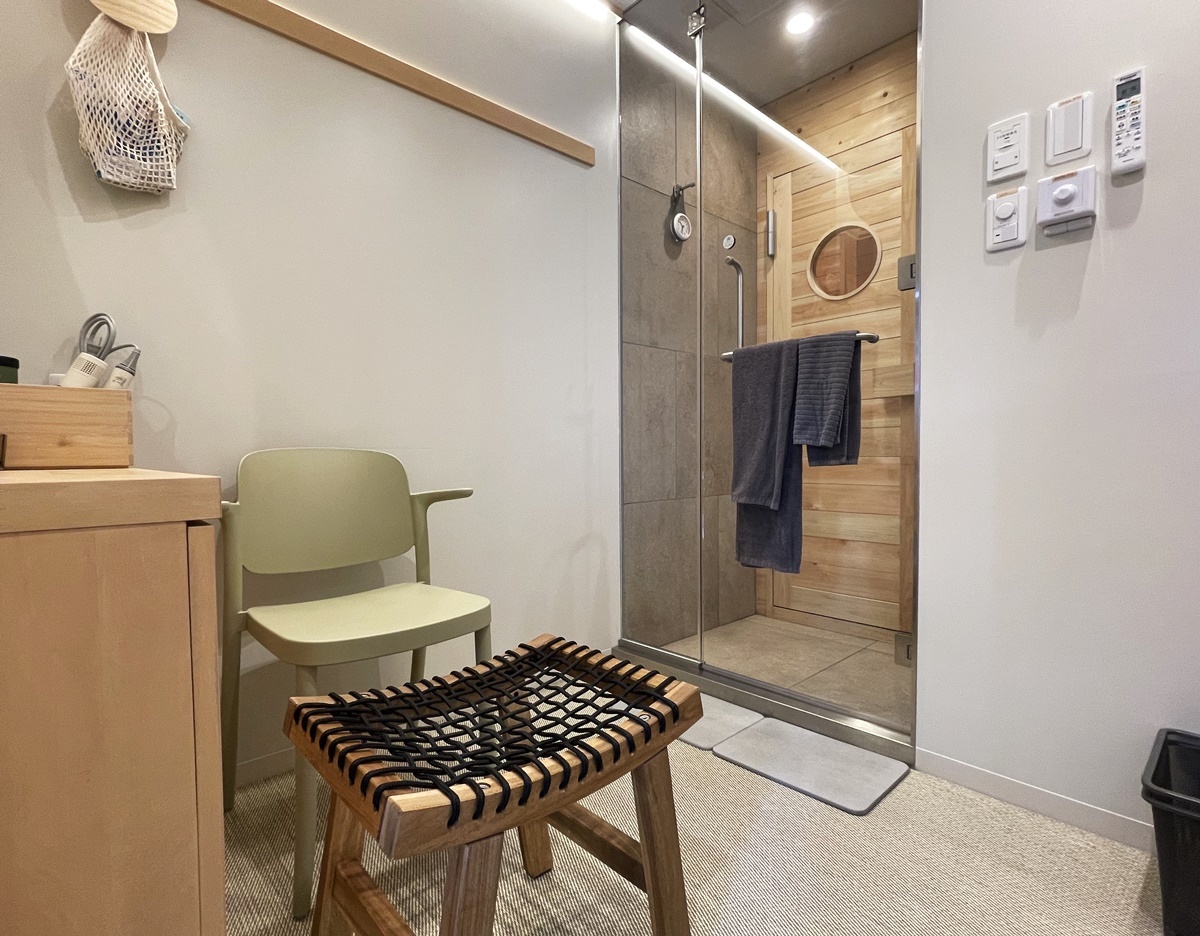 最大の特徴は、着替え+シャワー+サウナがひとつの部屋で完結すること。裸のまま敷地内をうろうろしたり、パウダールームに移動したりという手間がないから楽ちん! コンパクトな空間で、必要なものは手を伸ばせばすぐ届く“ちょうどよさ”が魅力です。
