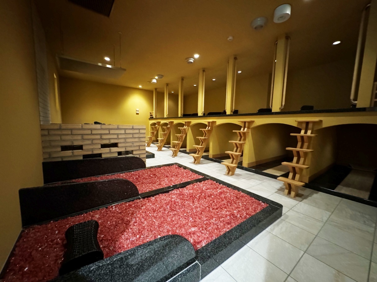 バリエーション豊富な岩盤浴は、岩塩、トルマリン、麦飯石と石が違う3種と、アロマオイルを投入し、香り付きの蒸気を楽しむロウリュウを合わせた4種類。男女共用スペースなので、カップルでも楽しめるのが魅力です!