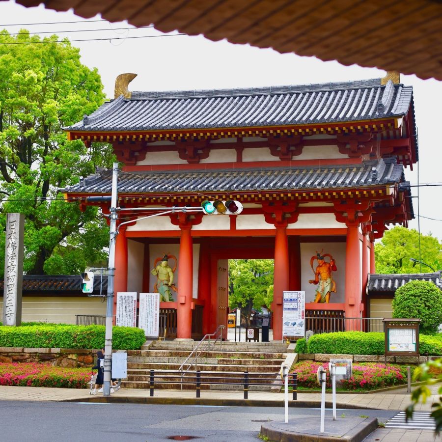 目と鼻の先に聖徳太子が建立した歴史ある寺院「四天王寺」の東大門がそびえるロケーションがここならでは。