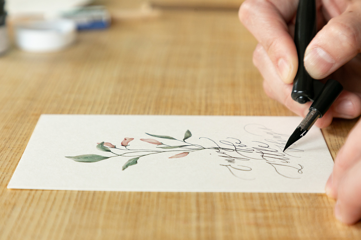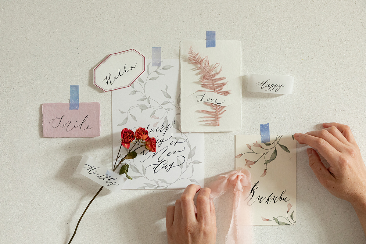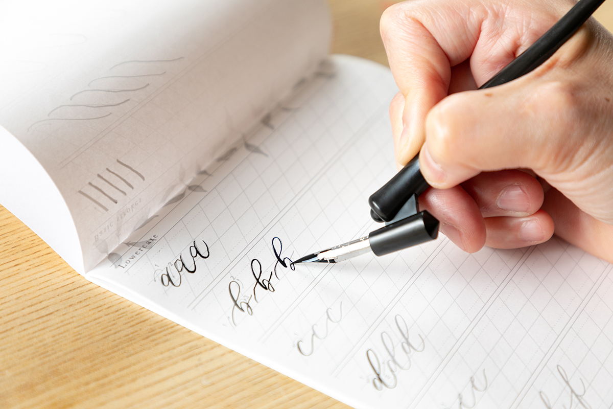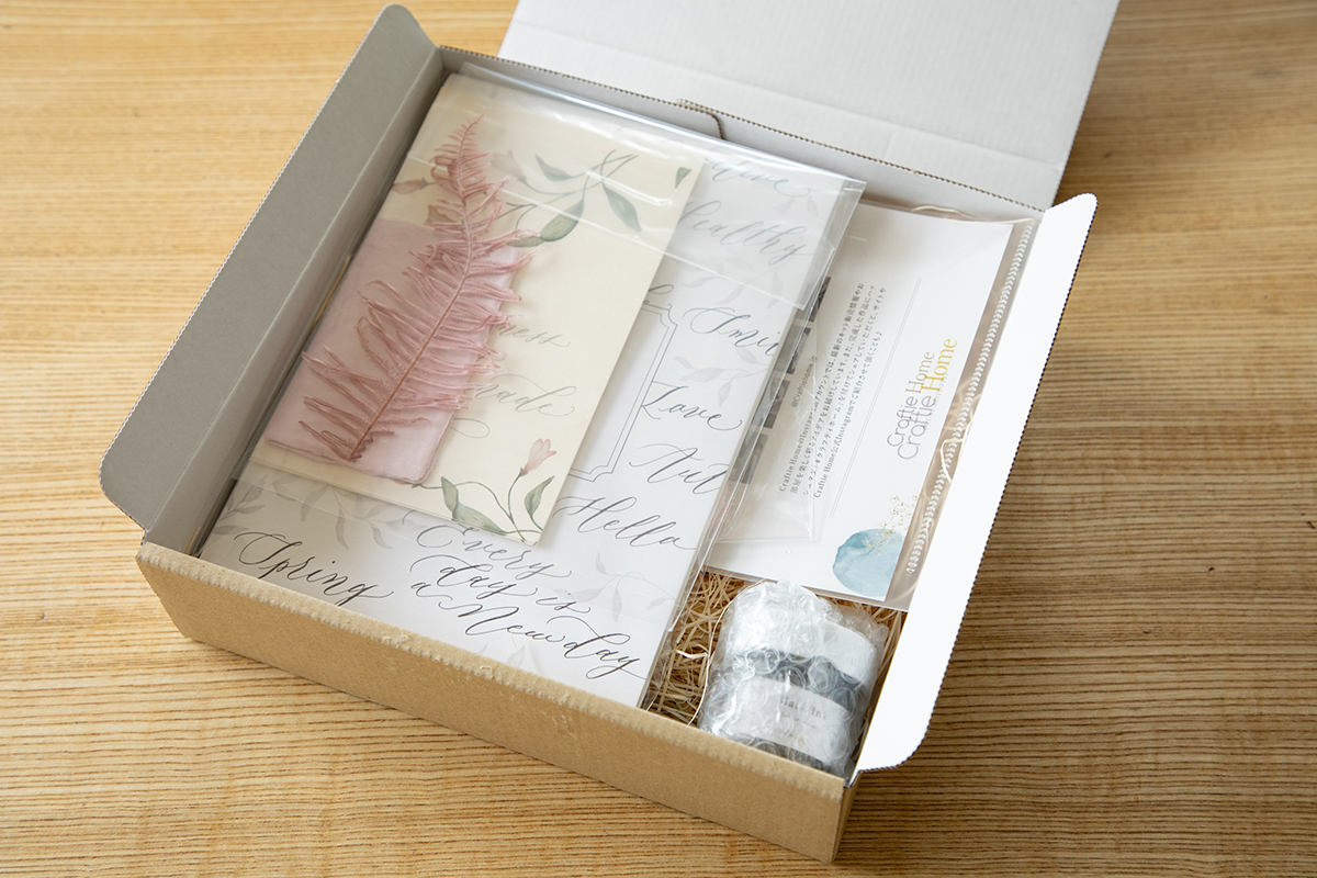カリグラフィーとは、文字を美しく見せる手法のこと。洗練された文字を自分でサラサラと描くことができたら、素敵ですよね。最近では、人気の香りブランドのメッセージサービスやカリグラファーによるライブペイントなどで、見かける機会が増えてきました。カリグラフィーは「西洋の書道」とも称され、ゴシック体、イタリック体、カッパープレート体など、さまざまな書体があります。今回の「Craftie Home Box」で扱う書体は、モダンカリグラフィーアーティスト・村田瑞記さんにより制作・監修されたもの。