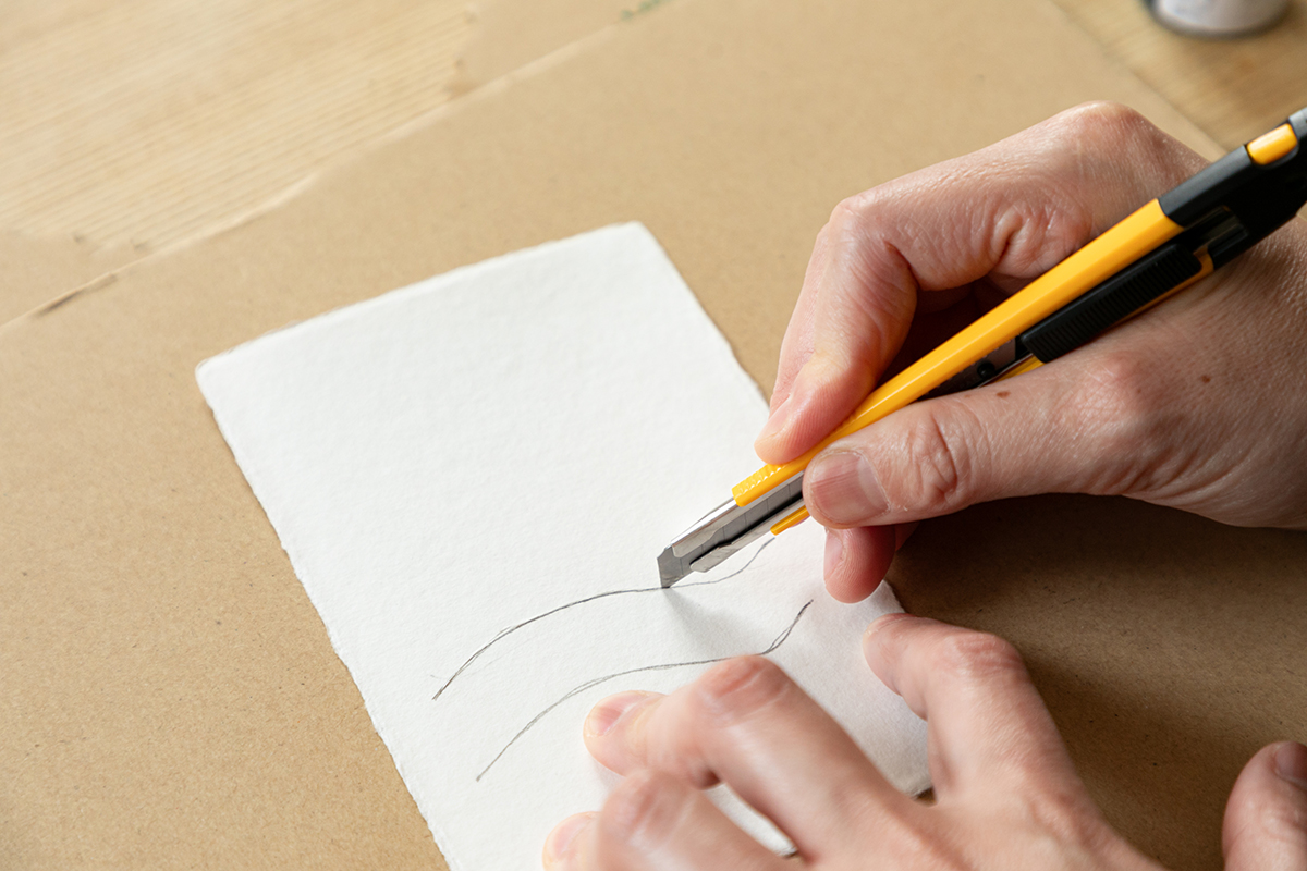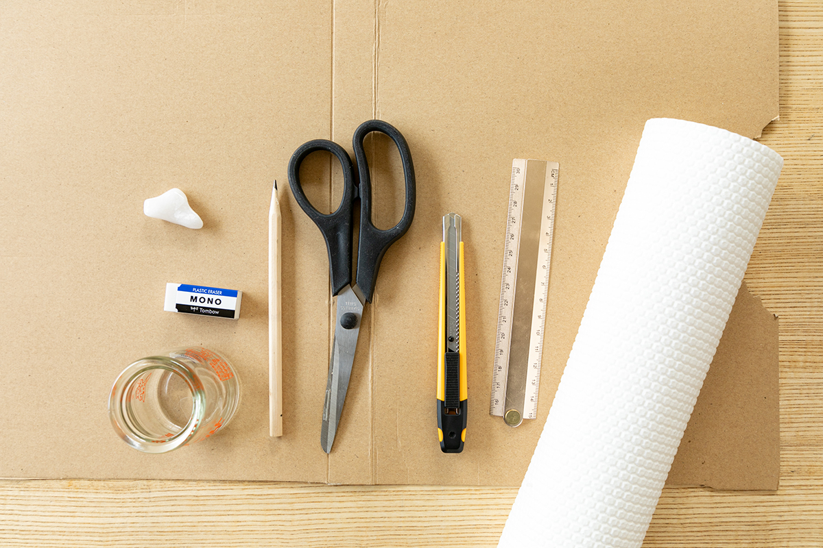 自宅で用意するものはこちら。ペン先を洗う水を入れる瓶、ペン先を置く箸置きのようなもの、消しゴム、鉛筆、ハサミ、カッター、定規、キッチンペーパー、カッティングボード。わざわざ買いに行くようなものはなく、家にあるものばかり。今回はカッティングボードがなかったので、捨てる予定の段ボールで代用しました。