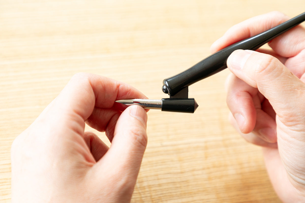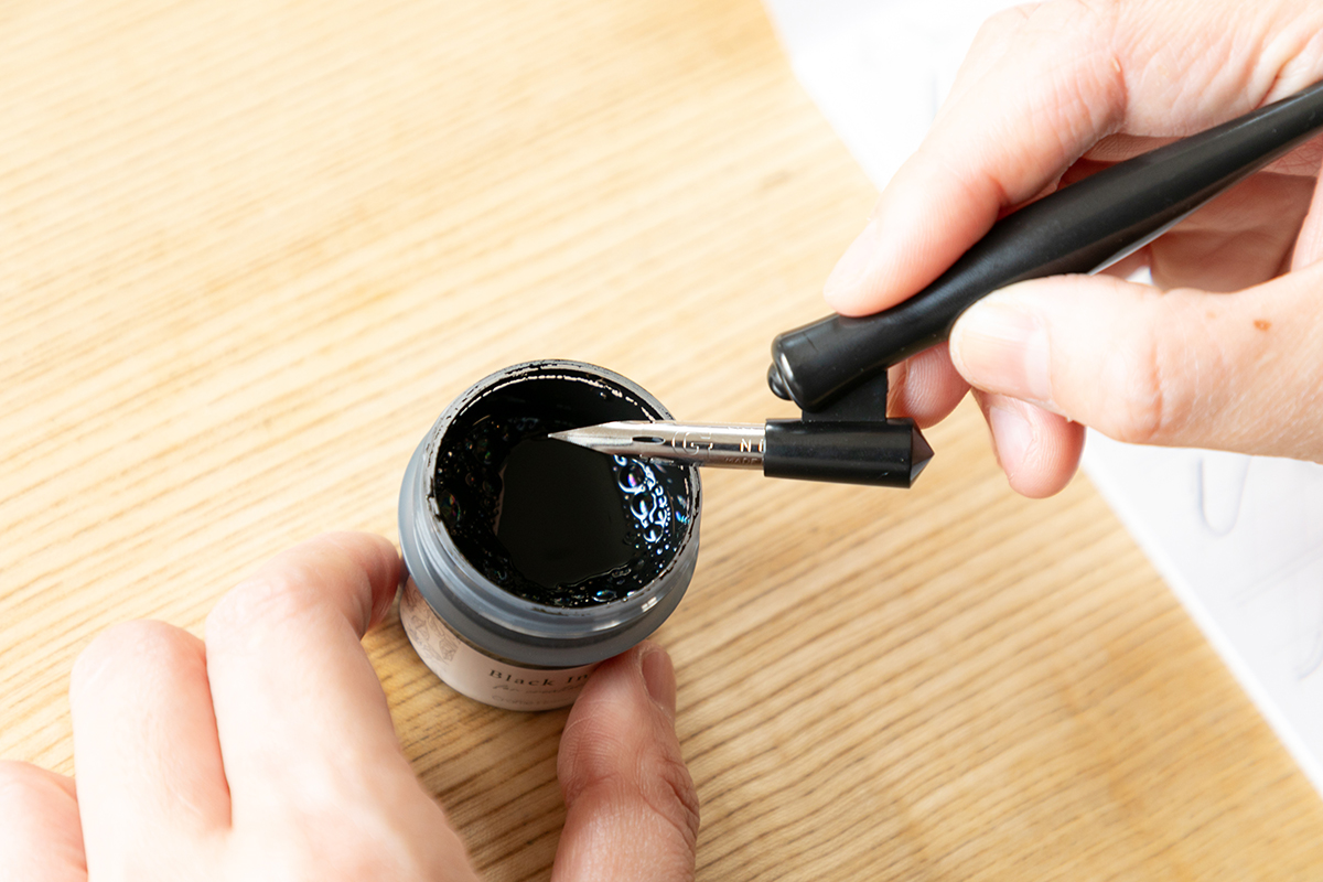 ペンが正しくセットできたら、インクをつけていきます。こちらのインクは15mlというミニサイズで、初めてカリグラフィーに挑戦するのにちょうどいい容量。インクはペン先の穴が隠れるぐらいまで、たっぷりとつけてOK。こういったことも、レシピ動画で教えてもらえるからこそ分かります。初心者にはとてもありがたい!