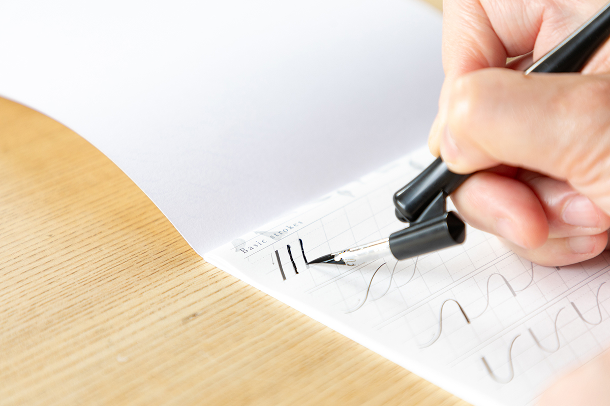ファーストステップは、線を引くところから。直線を引くだけなのに、普段のボールペンや鉛筆などとはまったく違う書き味に驚き。緊張して、背筋も伸びます。筆者は、カリグラフィー専用のペンを持つのは初めて。最初はやはり、書く文字がゆらいでしまいます。ただ、直線や波線、曲線などの基本的なペンの動かし方について動画レシピを見ながら一緒にやっていくうちに、数分でペンの扱いの要領が分かってきました!