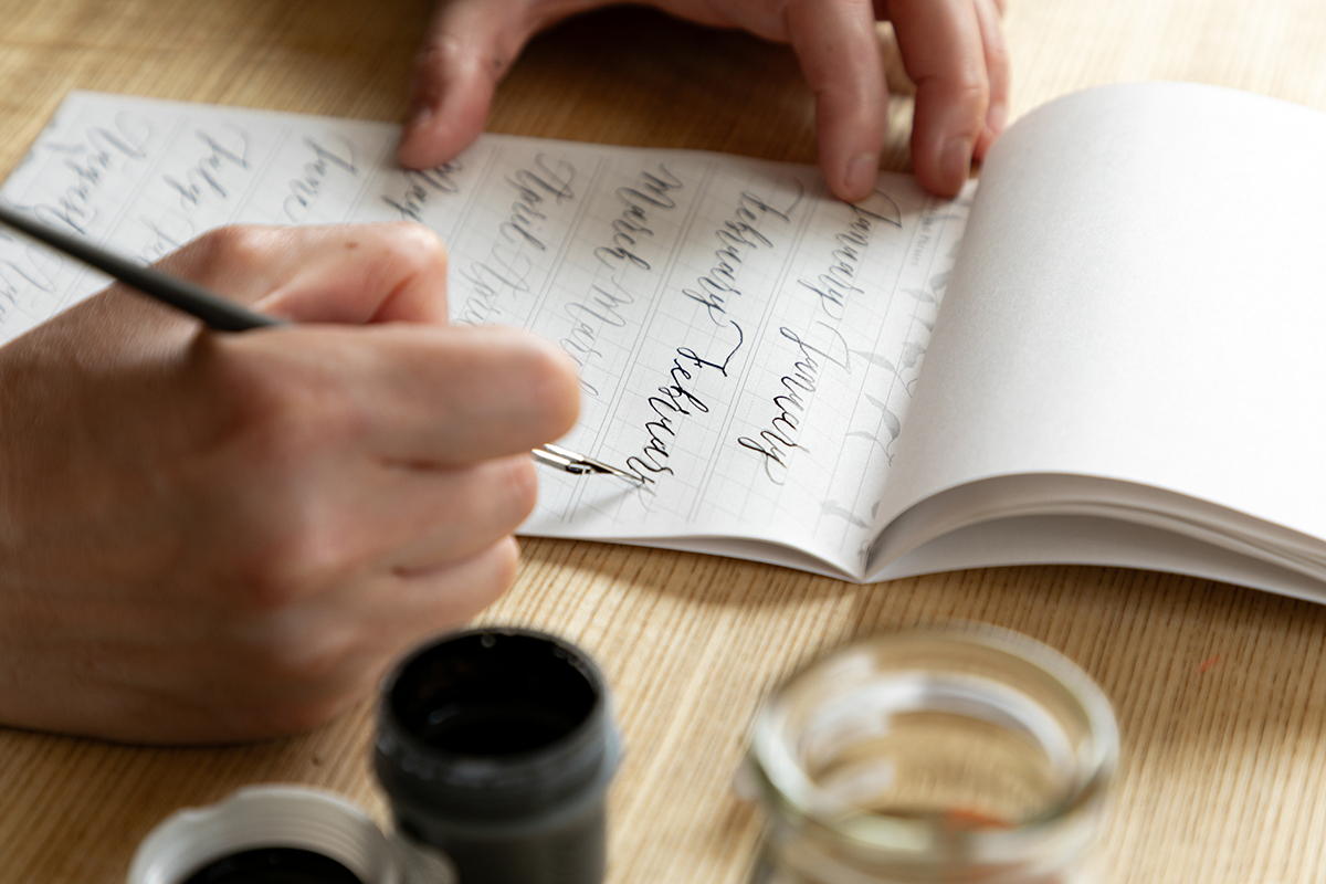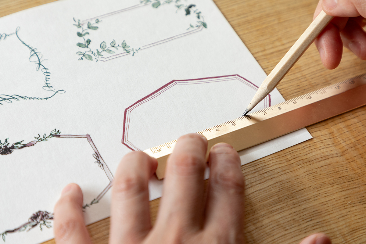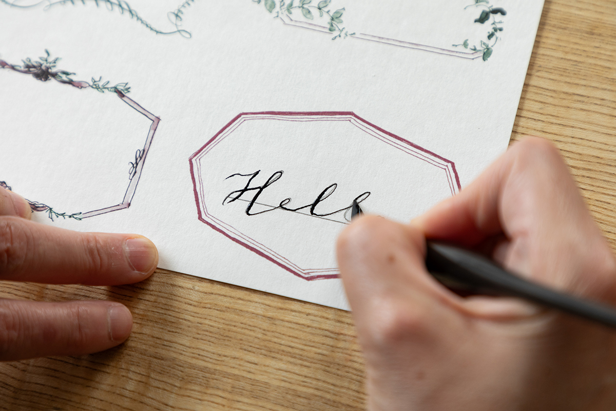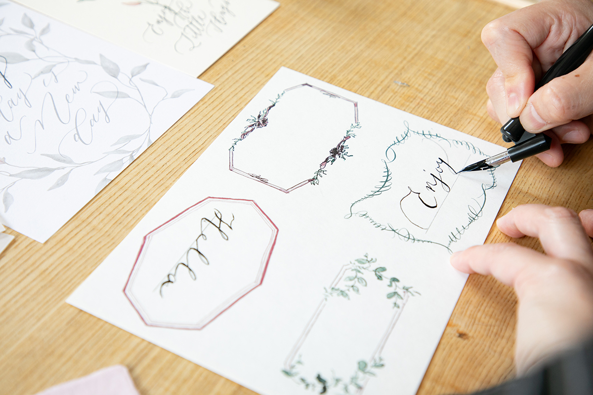 下書きを終えたら、その上からインクでなぞっていきます。最初はなかなか思うとおりにはいかないですが、何度も練習することで上達が見えるのが楽しく、ひとりだからこそ時間を気にせず没頭できます。