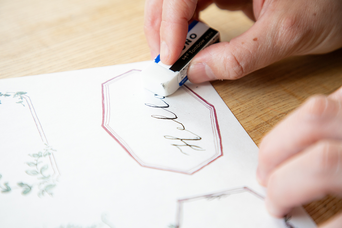 いろいろな文字を書いている10分くらいのうちに、デザインラベルに書いた「Hello」の文字が乾きました。消しゴムで鉛筆の下書きを消していきます。インクが十分に乾くまでは結構な時間がかかるので、乾いたかのチェックを。少しインクが擦れてしまいました……。