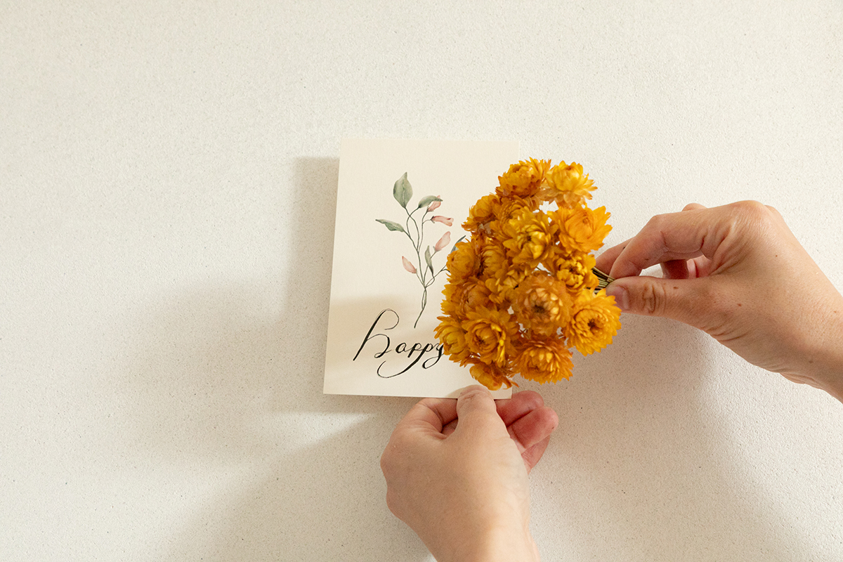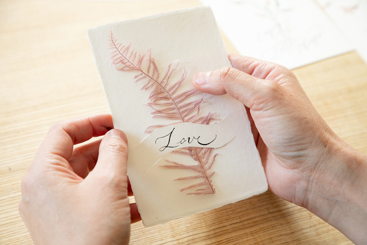 「Love」の文字も乾きました。消しゴムで鉛筆の下書きを消していきます。こちらはカッターで切り込みを入れた部分に、同梱の山シダを指すとレシピ動画でレクチャーされていたので、同じようにやってみました。まだまだ字はぎこちないですが、もう少し練習して上手に書けるようになったら、友人へのギフトに添えたい!