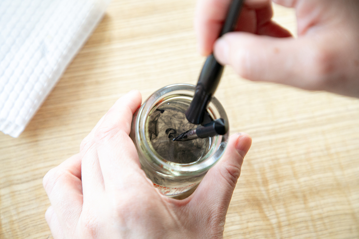 今日はこれで終わりにしよう!と決めなければ、延々とやってしまいそうです(笑)。今日の終わりを決めたら、まずはペンのメンテナンスをお忘れなく。瓶に溜めた水でペン先を洗っていきます。次使うときのために、これは忘れずに必ずやっておきたい工程です。