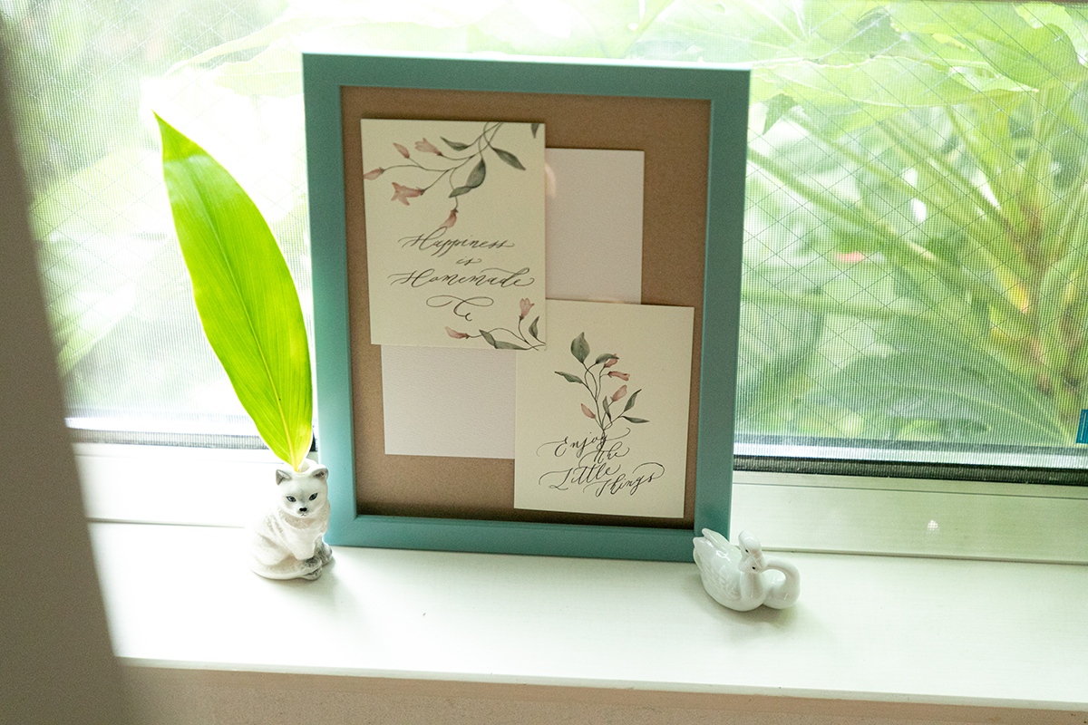 額に入れて飾るのも一案です。ポストカードとアートペーパーは、下書きがされているものなら、なぞるだけで素敵な文字が描けます。フリーハンドで、ここまで描けるようになりたいものです…!