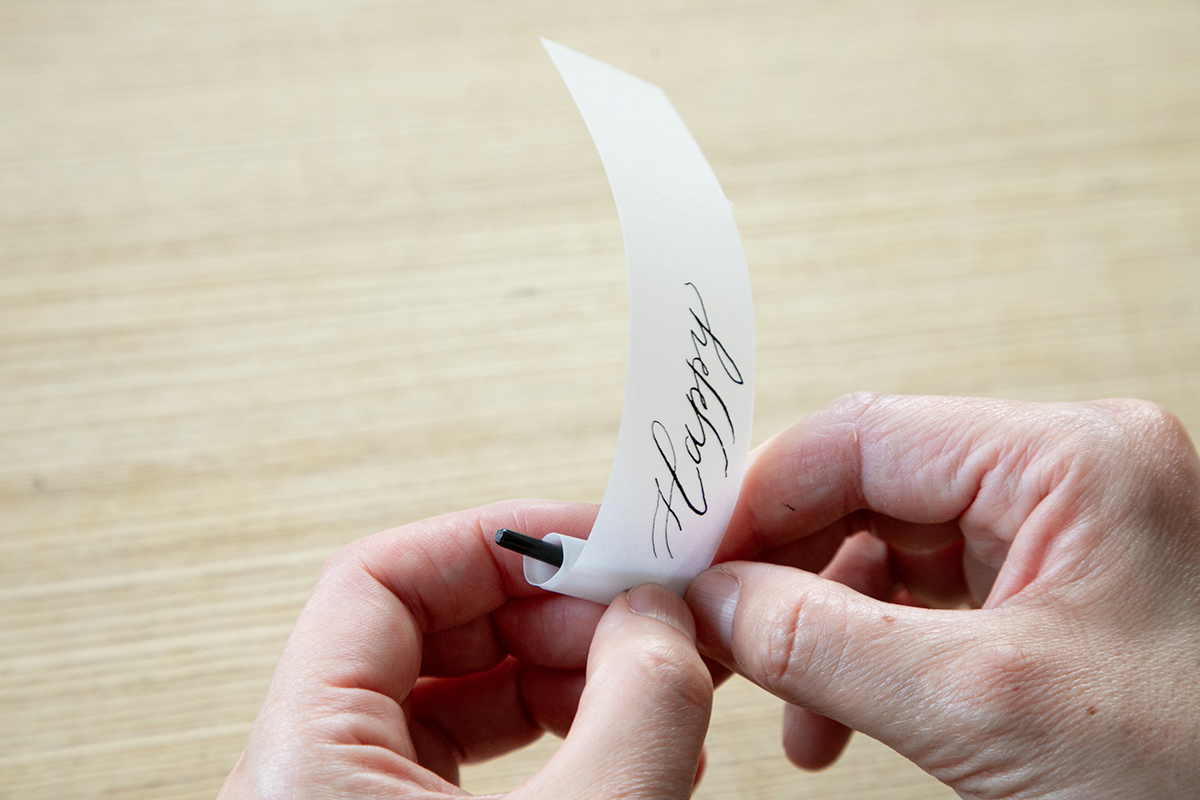 動画レシピにあった、透け感が楽しめるトレーシングペーパーのアレンジに挑戦。トレーシングペーパーを好きな幅にカットし、そこに好きなフレーズをカリグラフィで綴りました。動画レシピに習いつつ、ペン先で丸めていきます。