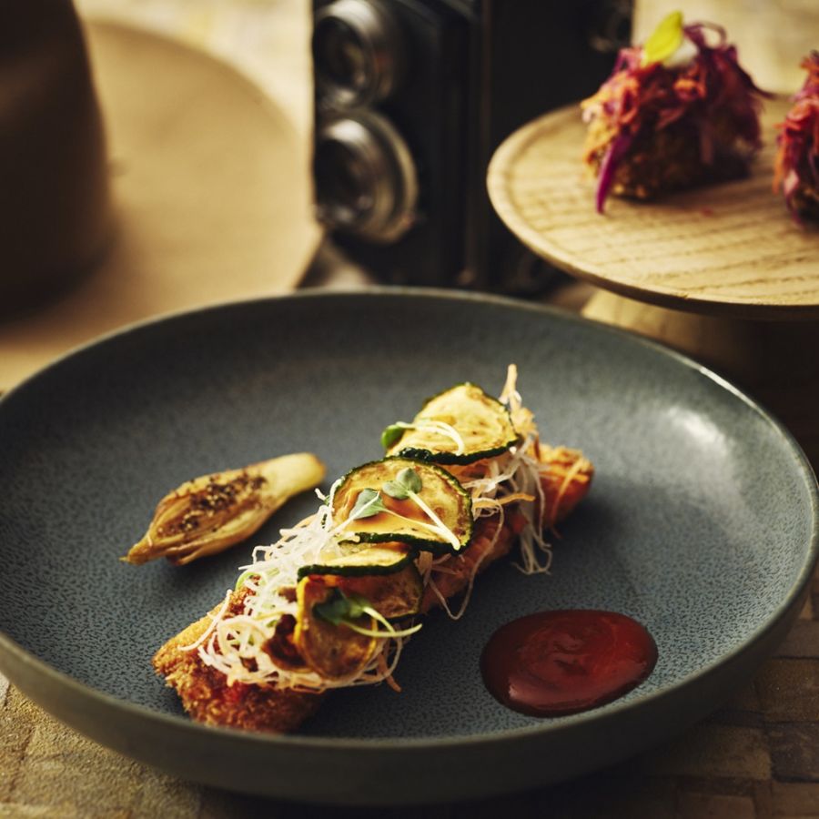 ・チャコールグリルで調理し、クラッシュした豆腐で日本のツイストを効かせた魚料理