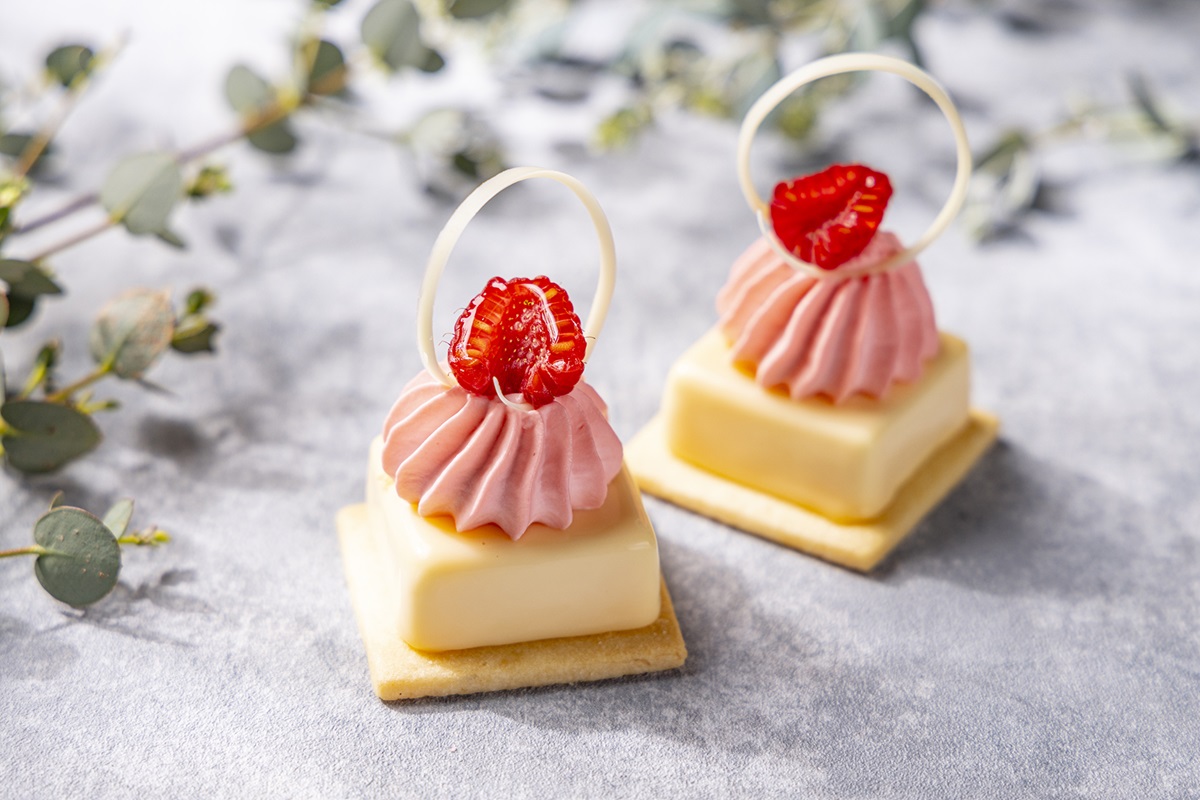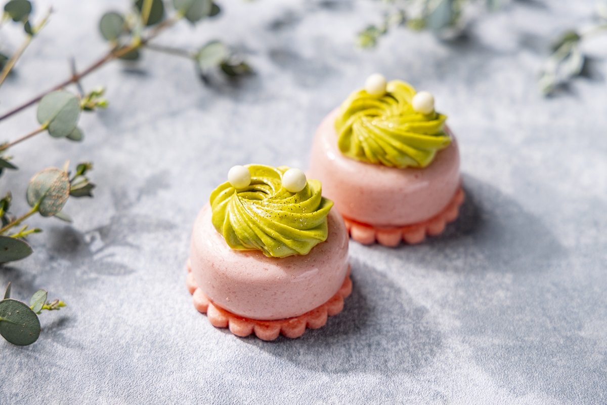 中にしのばせたストロベリーゼリーと、トッピングのピスタチオクリームが豊かな風味をプラス。ムースにはすっきりとした風味の小さな桃「ペッシュ・ドゥ・ヴィーニュ」を使用し、甘みとさわやかさの絶妙なバランスを実現します。