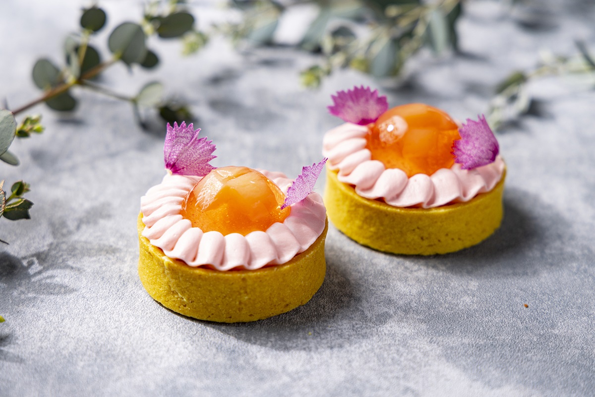 夏に咲き誇るヒマワリをイメージ。レモン風味のタルトの中にココナッツのガナッシュを入れ、カットした桃を閉じ込めたドーム型のエルダーフラワーゼリーをトッピングしています。