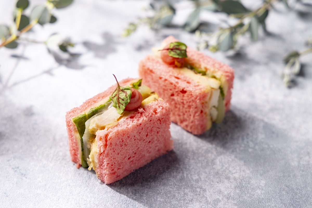 スイーツ&セイボリーは、バー&ラウンジ「トゥエンティエイト」の象徴的なボトル棚がモチーフのスタンドでの提供。スタンダードアフタヌーンティーのメニューに加え、「和牛頬肉と桃のミルフィーユパイ」がプラスされます。
