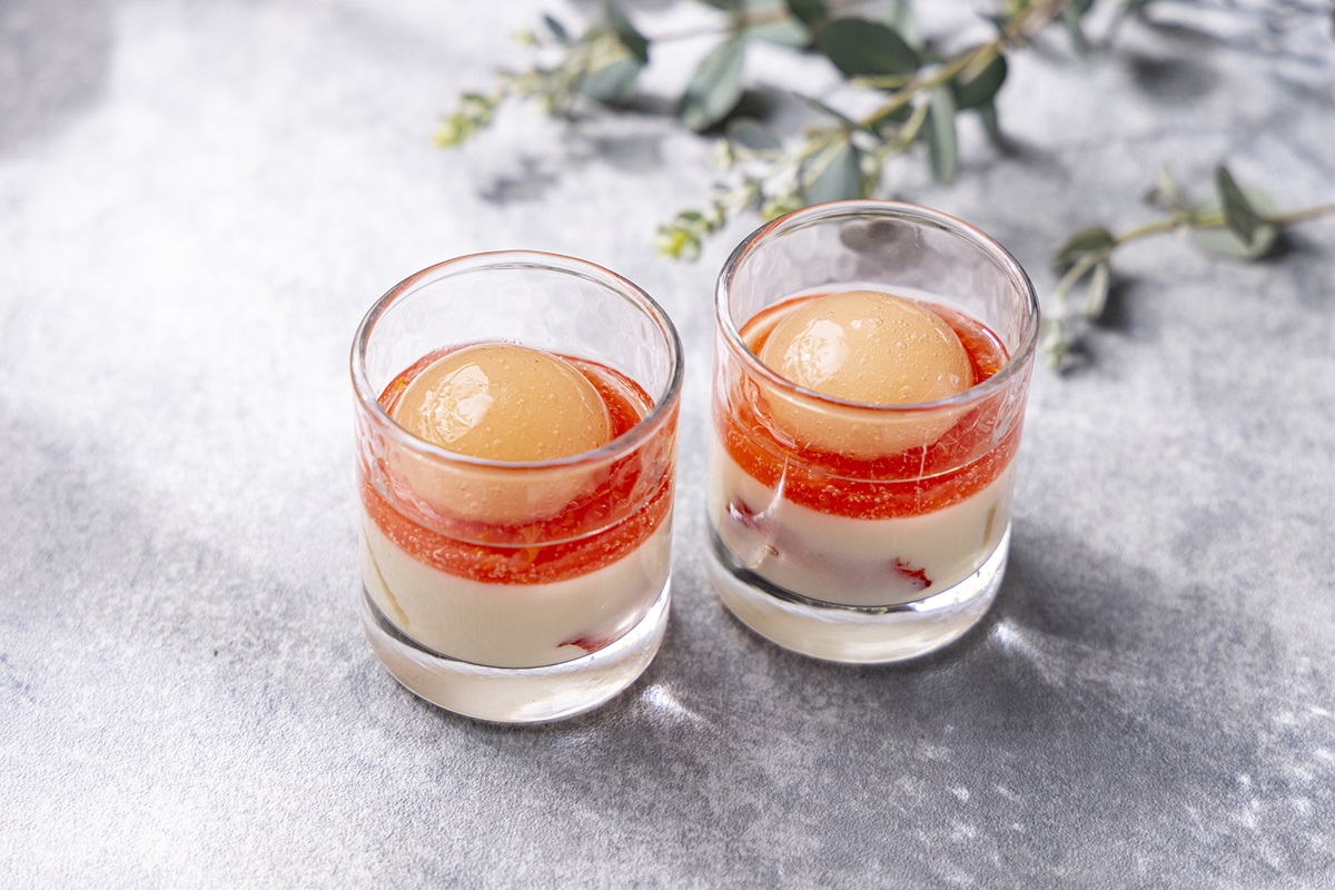 桃の果肉をクランベリーのシロップでコンポートし、マスカットゼリーと合わせていただきます。トップにのせたライチの泡が甘くさわやかな風味を引き立たせます。