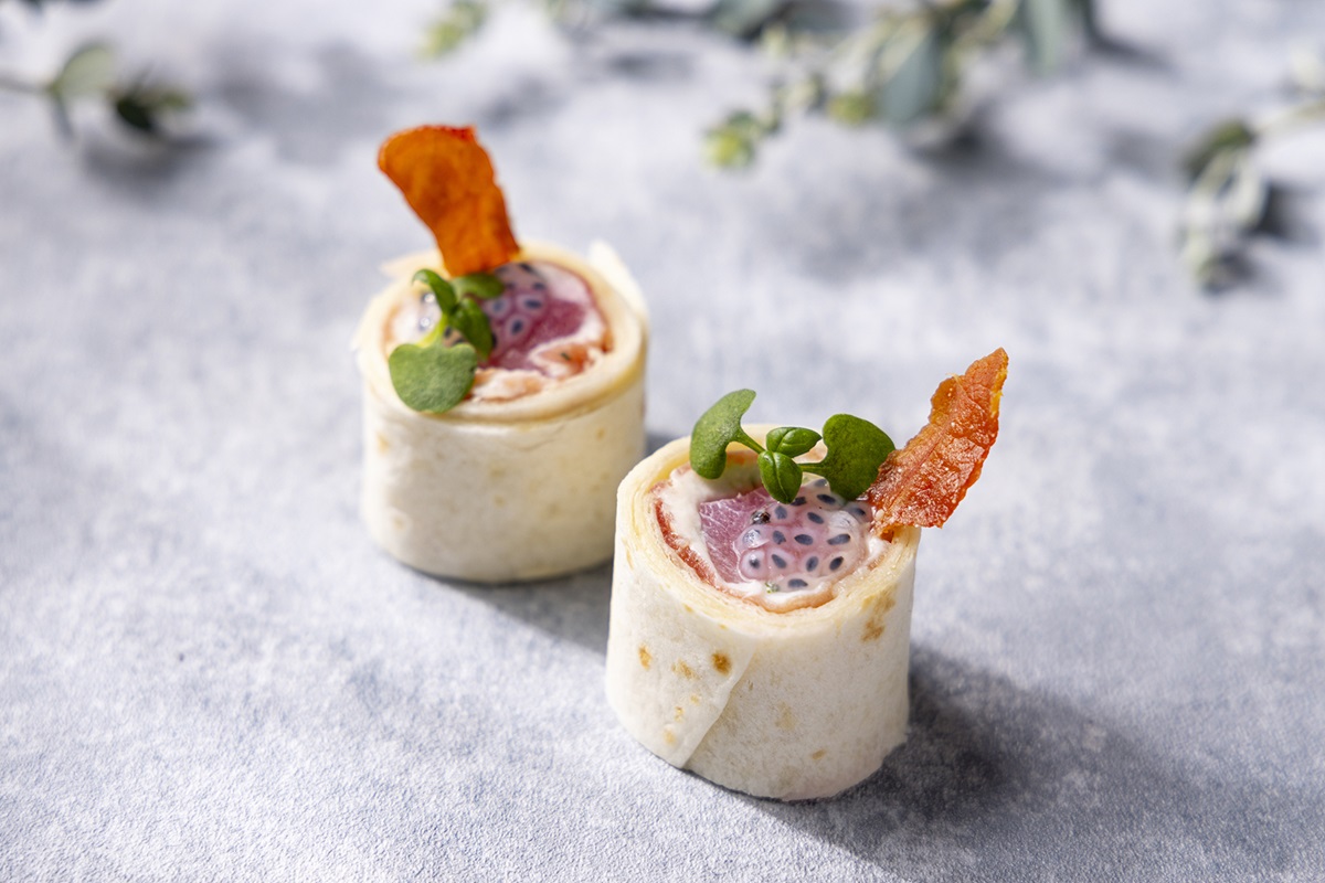 カプレーゼをイメージしたセイボリー。桃のコンポート、リコッタ&クリームチーズ、生ハムをトルティーヤ生地で巻いています。隠し味にはバジルシードを加えて。甘みと塩味、そしてチーズのコクのハーモニーを堪能できます。