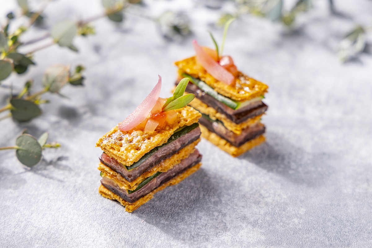 デラックスアフタヌーンティーのみの提供。赤ワインでほろほろに煮込んだ和牛頬肉と国産の桃をパイでミルフィーユ仕立てに。