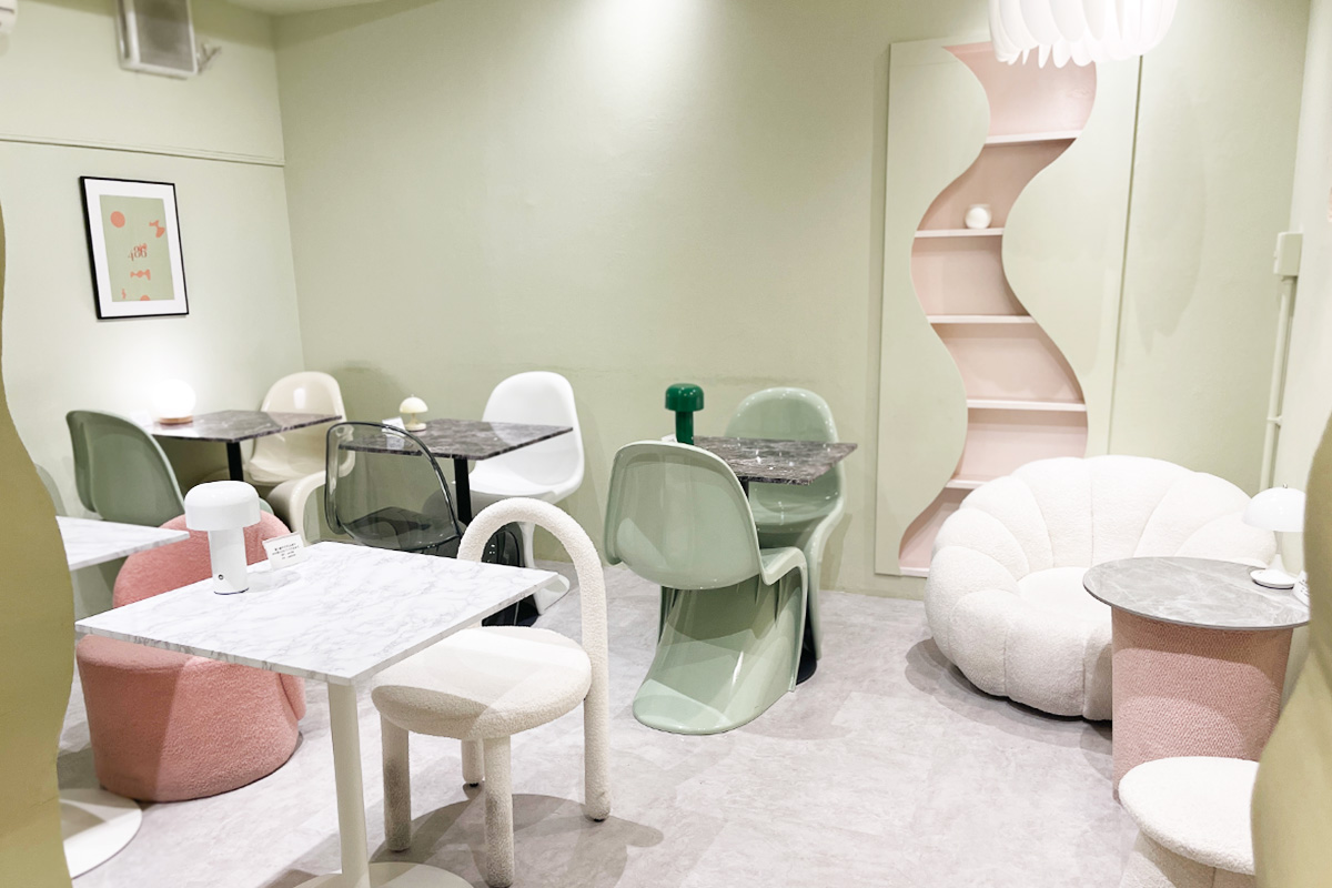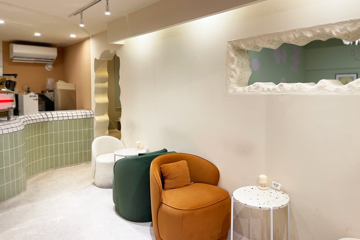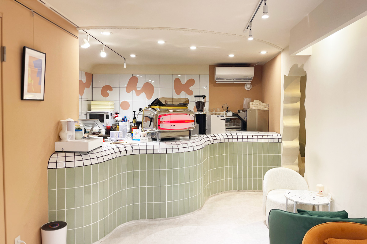 店内でまず目に入ってくるのが、タイルのカウンター。ゆるくカーブを描いたデザインが韓国らしくおしゃれ。壁のくすみオレンジ&パステルグリーンの配色もかわいく、ついつい写真に収めたくなる空間です。