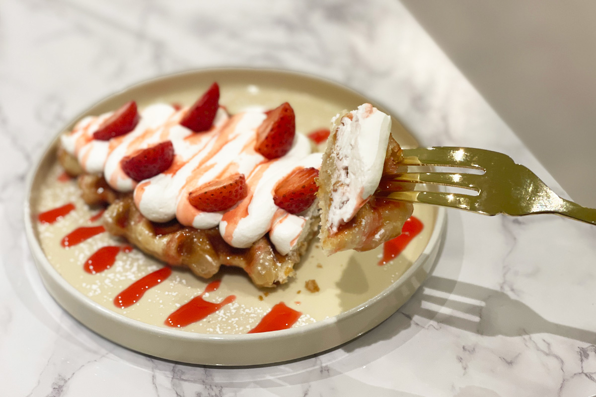 クロッフルの上には真っ白なクリームがトッピングされ、まるで雲のようなふわふわのフォルム。見た目のかわいさに思わずときめきます。