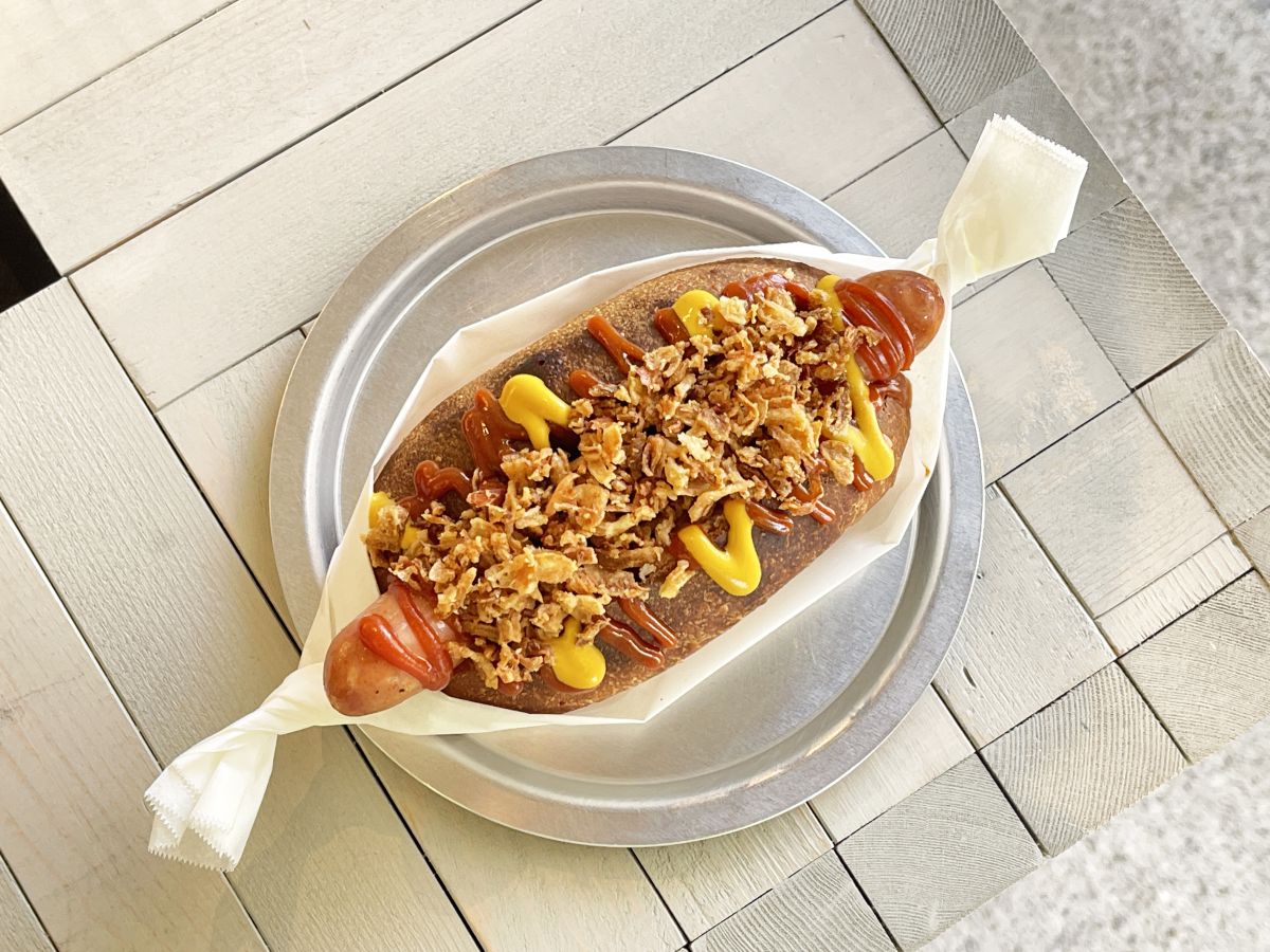 パリッとした歯ごたえやジュワッと広がる肉のうま味がたまらないソーセージと、ふんわり食感で食べごたえばっちりのパンは相性抜群! パンにアクセントとして食欲をそそるカレーソースが塗ってあって、あっという間に食べ終わってしまうクセになる味わい。たっぷりトッピングされたオニオンフライも香ばしさをプラスして、ホットドッグのおいしさを引き立てています。