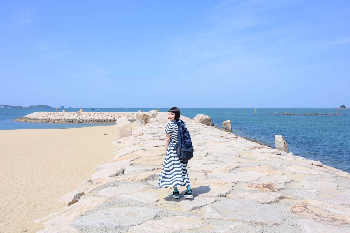 名前のとおり、扇を広げたような砂浜が広がる扇ヶ浜。写真左に見えるのが砂浜なのですが、私のいる石の堤防も素敵!足を汚すことなく海のそばまで行けるのは結構うれしい。さて、ここを訪れた目的は……