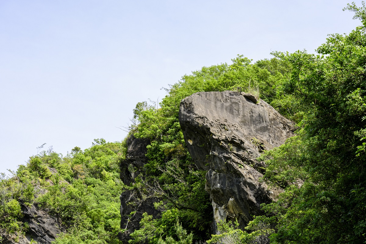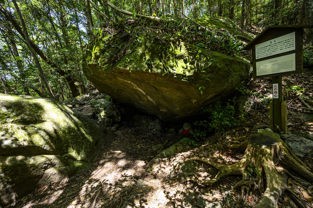 こちらは「乳岩」という、出産にまつわる伝説が残る岩。奥州の武将・藤原秀衡夫妻が熊野詣の途中、妻が急に産気づきここで出産し、夢で聞いた熊野権現のお告げを受けて赤子をこの岩に残して熊野に向かいました。戻ってみると、赤子は岩から滴る乳を飲み、オオカミに守られて無事だったと伝えられています。