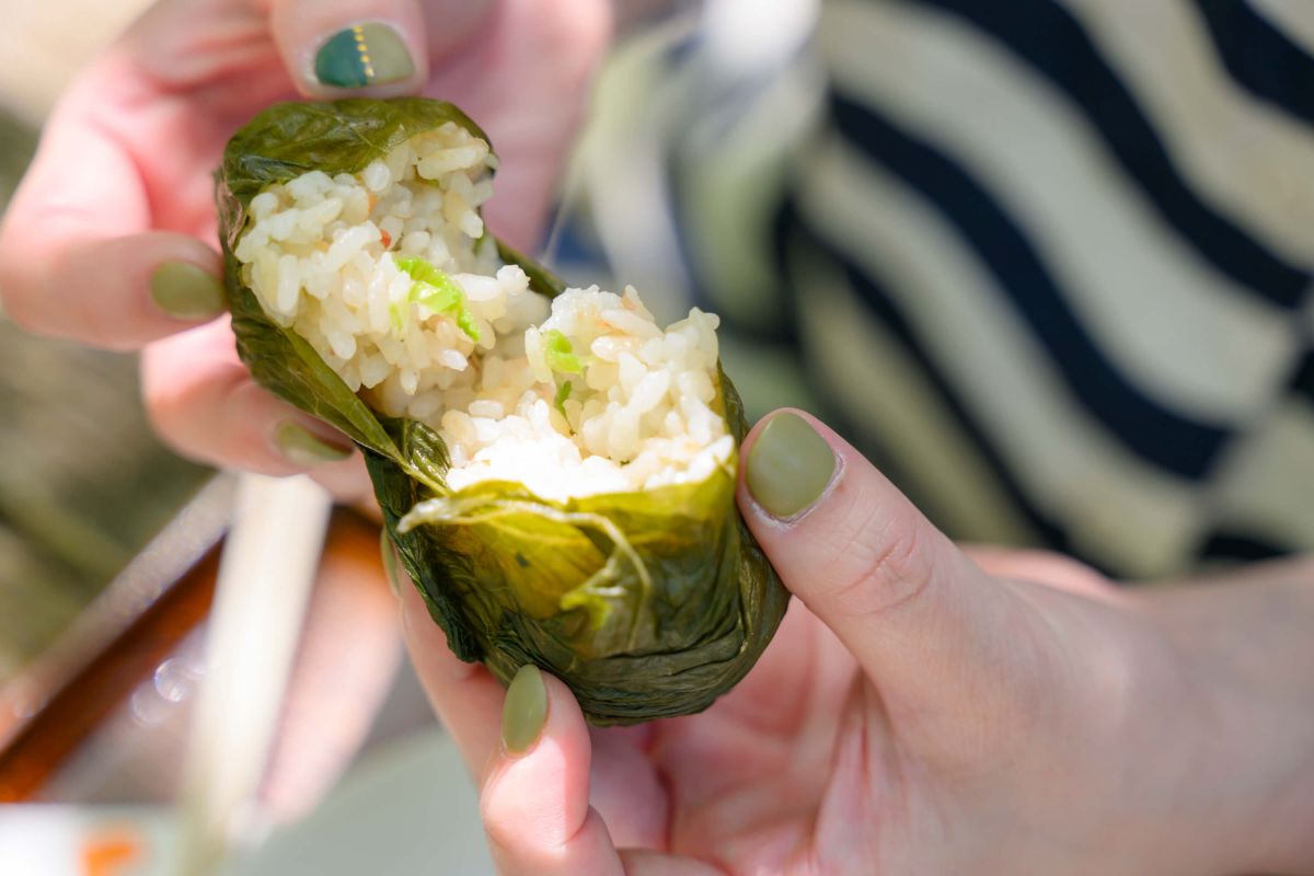 こちらは郷土食の「めはり寿司」。高菜の浅漬けの葉で大きなおにぎりを包んだものです。