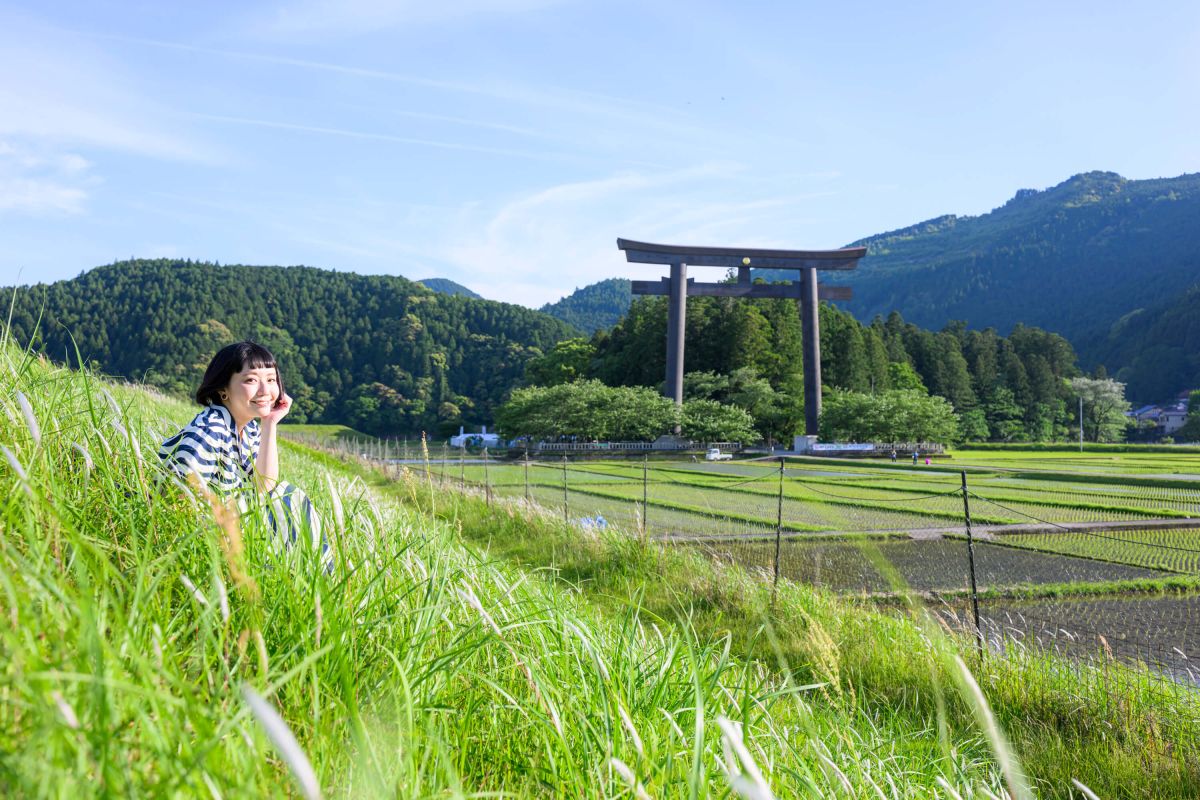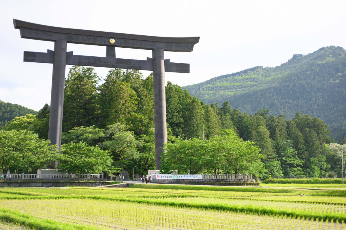 熊野本宮大社から徒歩で約10分の「大斎原(おおゆのはら)」も併せて訪れたい聖地です。高さ約34m、幅約42mの日本一大きな大鳥居がそびえ立つ景色は圧巻。(写真を拡大して見ていただきたい…!鳥居の下に小~さく写っている人の姿を見ると鳥居の大きさにびっくりするはず…!)